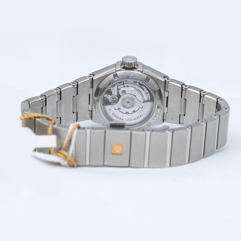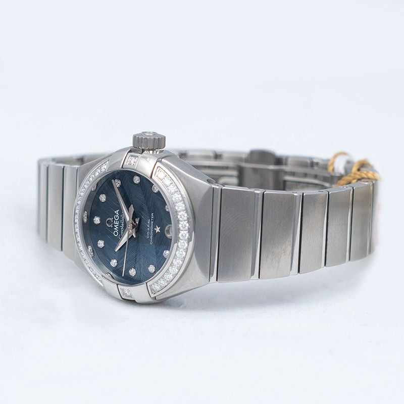 The Omega Constellation Co-Axial 27MM, reference 123.15.27.20.53.001, embodies timeless elegance with its refined and enduring design. Favored for its understated yet luxurious aesthetic, this model showcases a deep blue lacquered dial with a delicate feathered pattern, adorned with 11 diamond indexes for a touch of brilliance. A date window replaces the 6 o’clock marker, while a transparent caseback reveals the precision of the Omega Co-Axial Calibre 8520. The watch is housed in a 27mm stainless steel case with a diamond-set bezel and paired with a matching steel bracelet. Its domed, scratch-resistant sapphire crystal with anti-reflective treatment on both sides ensures clarity and durability. Elegant, reliable, and beautifully crafted, the Constellation is a true symbol of Omega’s heritage in luxury watchmaking.