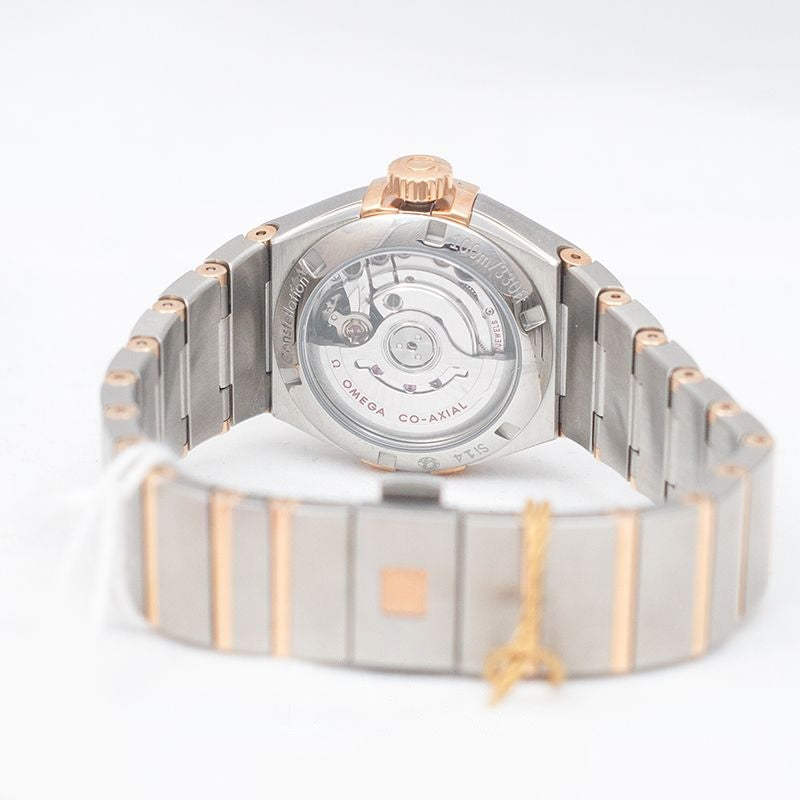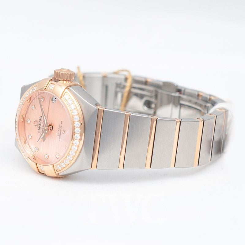 Every watch in the Omega Constellation collection is defined by its dramatic style and the iconic “Griffes” on the bezel, and the 27MM is no exception. This refined model features a stainless steel case topped with a red gold ring set with diamonds, paired with a stainless steel bracelet accented by 18K gold links. Its coral-toned mother-of-pearl dial is beautifully detailed with a wavy pattern and diamond indexes, adding elegance and depth to the design. A scratch-resistant sapphire crystal protects the dial, while the transparent caseback reveals the Omega Co-Axial Calibre 8520 movement, ensuring accuracy and reliability. Water-resistant to 100 meters (10 bar), this timepiece blends luxury and durability in perfect harmony.