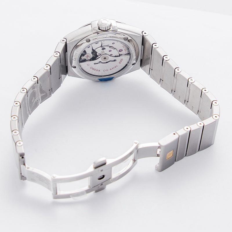 The Omega Constellation Co-Axial 38 (Ref. 123.10.38.21.02.001) is a stylish and timeless men’s watch, featuring a 38mm stainless steel case with the collection’s signature “Griffes” and a bezel engraved with Roman numerals. Its silver dial, protected by a scratch-resistant sapphire crystal, displays stick and dot indexes, dauphine hands, and a date window at 3 o’clock. Powered by the Omega Co-Axial Calibre 8500 with a 60-hour power reserve, the watch is visible through a transparent caseback. The stainless steel bracelet complements the case, while water resistance up to 100 meters (10 bar) makes it both elegant and practical for everyday wear.