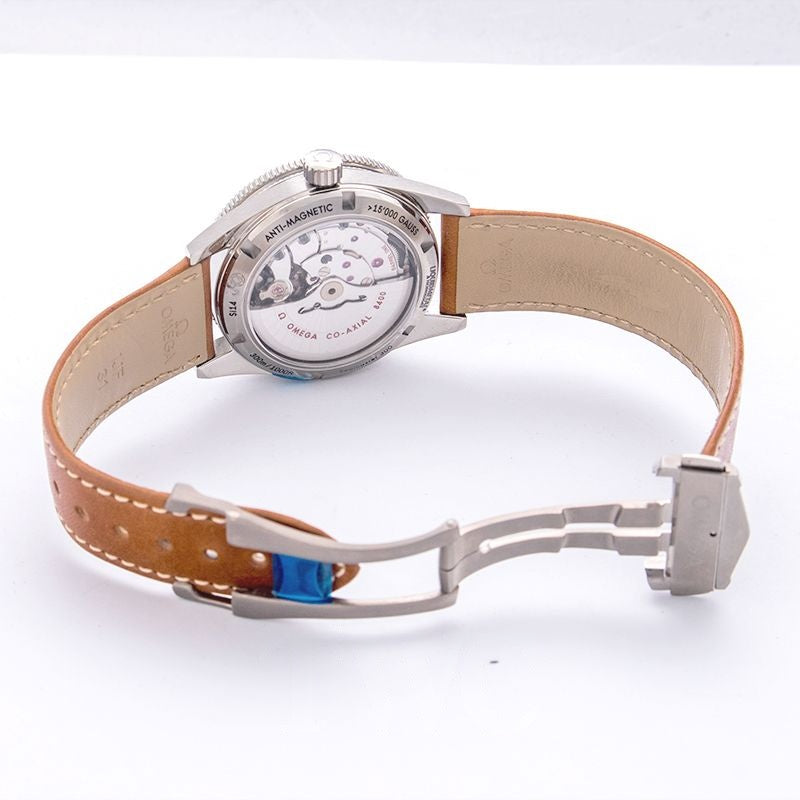 The OMEGA Seamaster 300 Master Co-Axial (Ref. 233.92.41.21.03.001) is a 41mm titanium timepiece that redefines a classic first introduced in 1957. Crafted for divers and underwater professionals, this model combines robust water resistance with refined style. Its sand-blasted blue dial features vintage-inspired indices and luminous hands, complemented by a Liquidmetal® diving scale on the bezel. Secured on a leather strap, the watch is powered by the anti-magnetic OMEGA Master Co-Axial Calibre 8400, offering precision, durability, and timeless elegance.