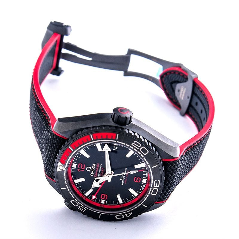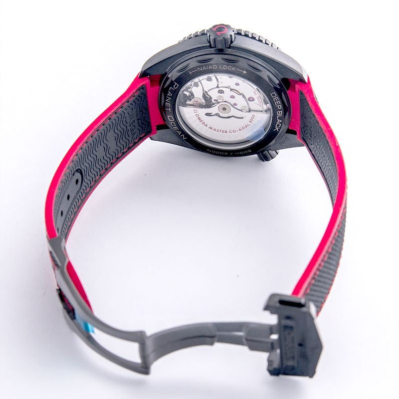 The Omega Seamaster Planet Ocean 600M (Ref. 215.92.46.22.01.003) is a bold and innovative diving watch designed for both performance and style. Crafted from a single block of matte black ceramic, its robust case features a transparent caseback revealing the Omega Master Chronometer Calibre 8906. The unidirectional bezel is enhanced with rubber covering the first 15 minutes of the diving scale—a distinctive feature for professional divers. The black dial, accented with red Arabic numerals at 6, 9, and 12 o’clock, is complemented by white hands and indexes coated with Super-LumiNova for optimal legibility. Paired with a black rubber strap edged in red, this timepiece is water-resistant to an impressive 600 meters (60 bar), making it a true icon of Omega’s diving heritage.