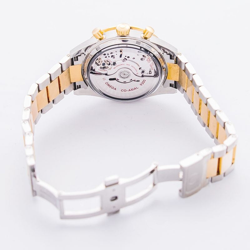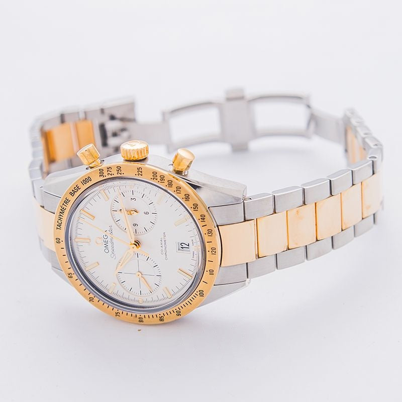 The OMEGA Speedmaster '57 Co-Axial Chronograph (Ref. 331.20.42.51.02.001) is a 41.5mm stainless steel watch with elegant 18K yellow gold accents. Its silvery dial features a date window at 6 o’clock, two sub-dials at 3 and 9 o’clock for seconds and a 12-hour/60-minute chronograph, and a central chronograph seconds hand. The dial is protected by a scratch-resistant crystal, while the 18K yellow gold bezel displays a tachymeter scale. This sophisticated chronograph is presented on a matching bracelet and powered by the OMEGA Co-Axial Calibre 9300, combining precision, style, and reliability.