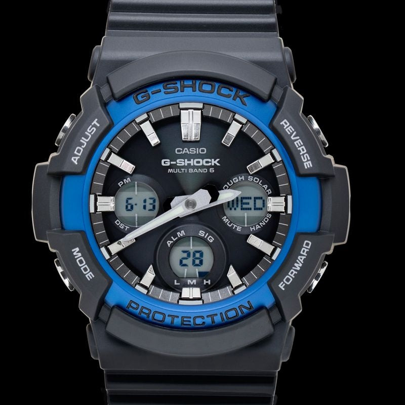 The Casio G-Shock GAW-100B-1A2JF men's watch comes from the Japanese watchmaker Casio, and it promises to stand the test of time. It has a solar quartz movement; its case diameter is 52.5mm and has a thickness of 16.7mm. This timepiece is packed with the following features: chronograph, alarm, perpetual calendar, power reserve indicator, date, day, and month display, backlight, countdown timer, world time, radio control, and water resistance of 200 metres. Made from aluminium and polymer, the case is sleek in design and durable in nature. There are blue accents on the bezel for extra appeal.