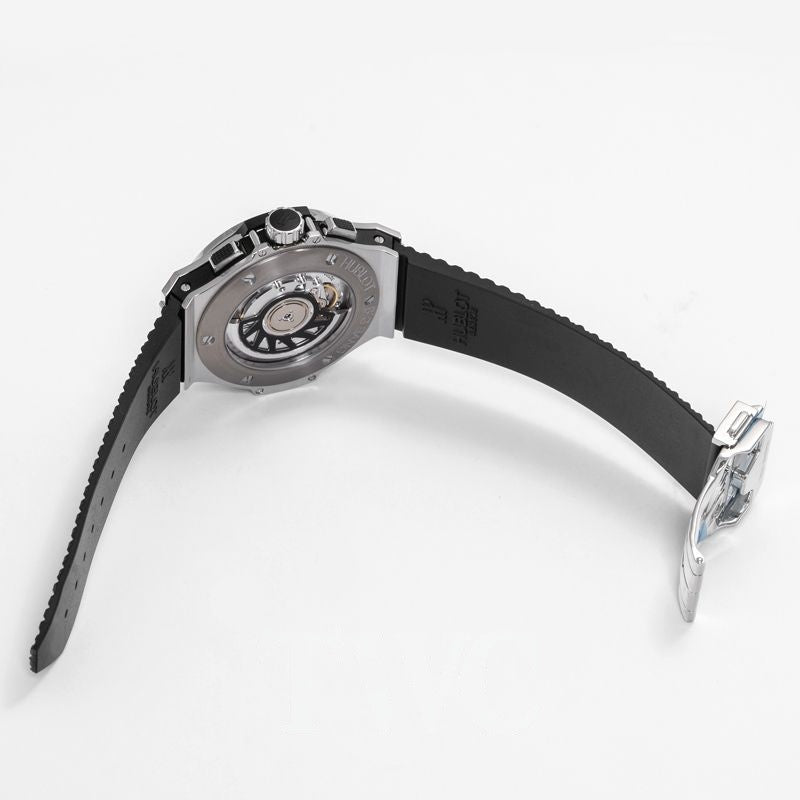 A finely crafted timepiece, the Hublot Big Bang 341.SX.130.RX.114 45mm watch redefines luxury in watches with a stainless steel bezel fitted with 6 titanium screws and embellished with 114 pieces of diamonds. It's one of a kind among Hublot watches with a water resistance of up to 100 meters. It features highly detailed black baton dial with luminous hands and Arabic numerals. This alluring unisex men's watch, adds an air of luxury to anyone wearing it and comes with a black rubber strap, finished with deployant buckle clasp. This self-winding chronograph watch delivers the finesse of Hublot watches and comes power-packed with 42 hours of power reserve that keeps you going.