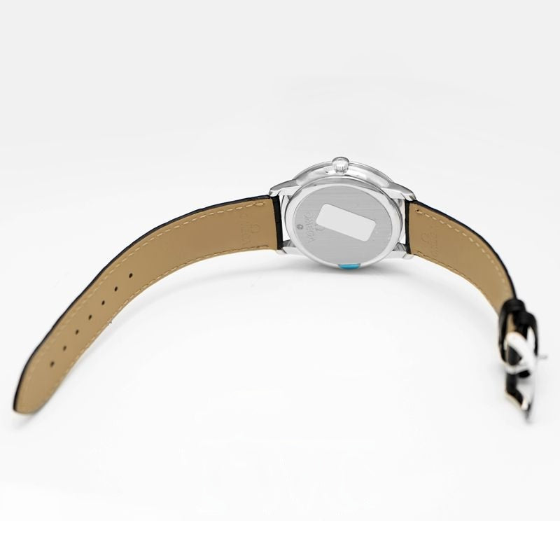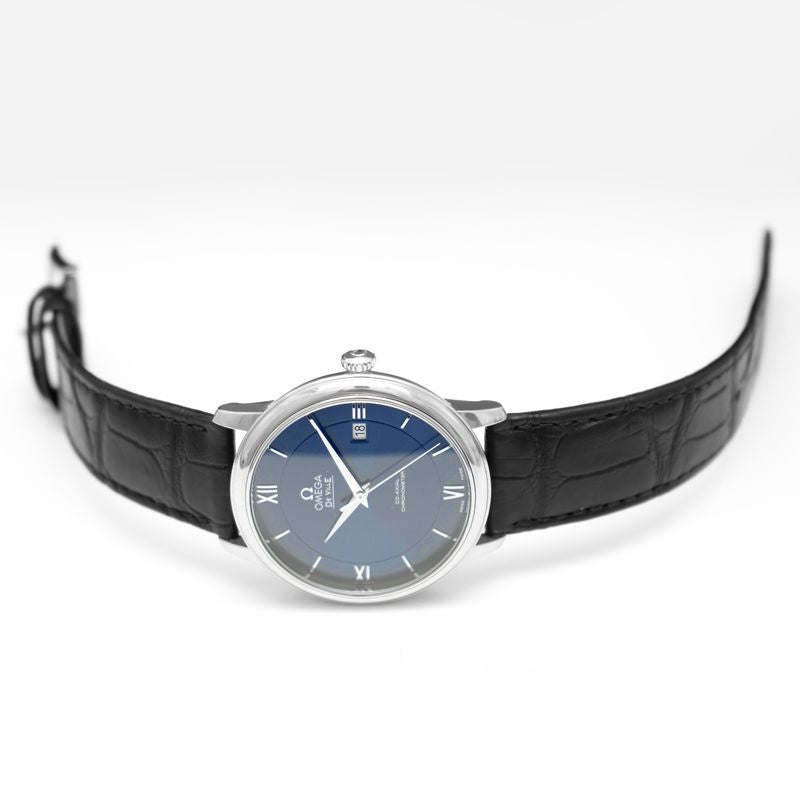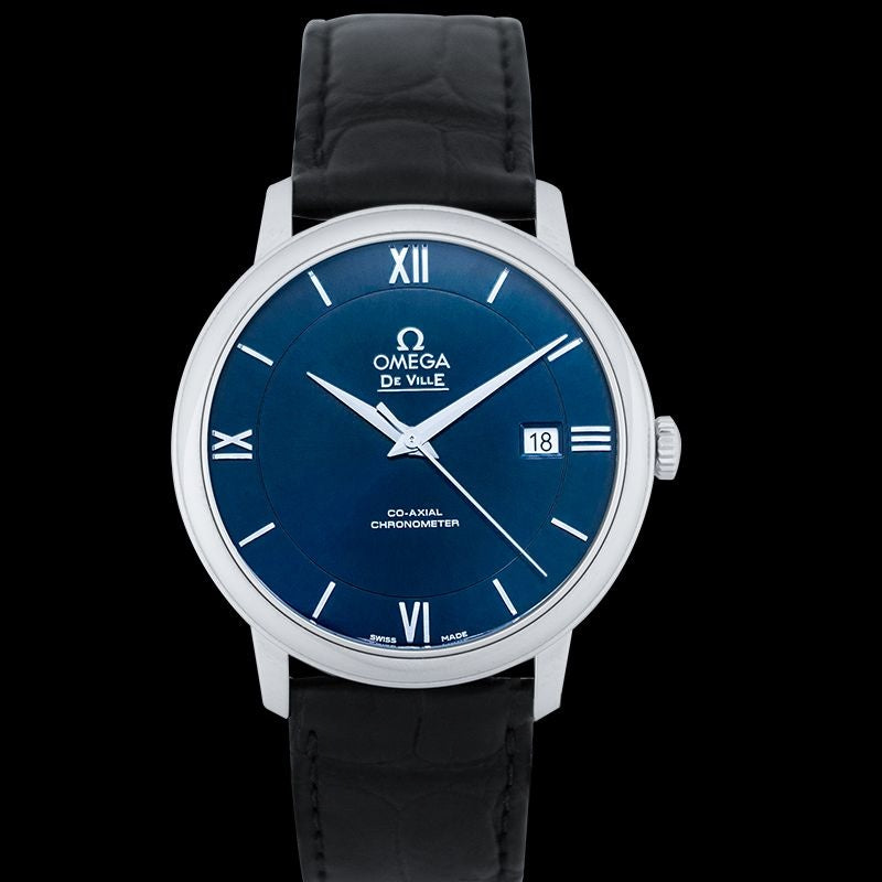 This model of the world-famous OMEGA De Ville collection is a subtle timepiece that every man would want to own and wear. The Omega dress watch has a classic round silver case with a solid back and diameter of 39.5mm, as well as lug width of 20mm. The leather strap is soft and comfortable and can easily be matched with formal and casual apparel. The dial is plain blue and is complemented elegantly with silver-tone hands and Roman numerals at the 3, 6, 9, and 12 o'clock positions. Designed to withstand 3 bar (30 meters/ 100 feet) of water pressure, this luxury watch is both fun and business!