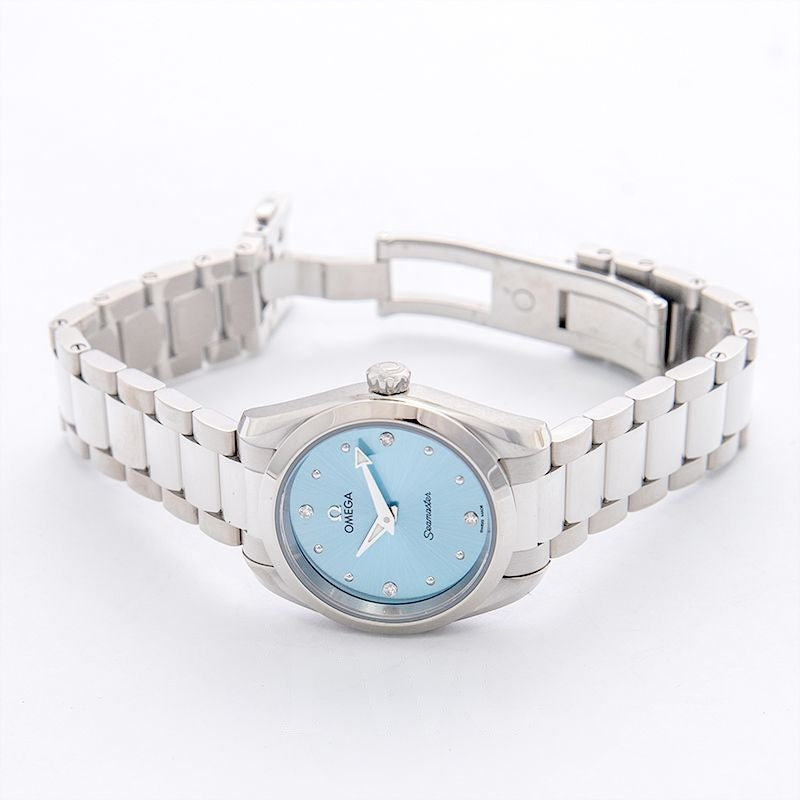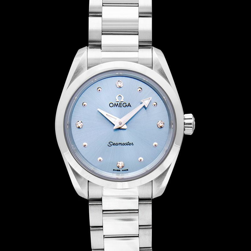 The OMEGA Seamaster Aqua Terra 150m Quartz 220.10.28.60.53.001 is a women's watch that reflects the beauty of being feminine. It has a symmetrical 28mm case, which is crafted in well-polished stainless steel. At the centre, there is a glossy ice blue dial with diamonds studded as hour markers. They are held by shiny, rhodium-plated holders that match the faceted minute and hour hands. Mounted on the case is a complementing steel bezel. Powered by the OMEGA Calibre 4061, this Seamaster steel diamond watch comes presented on a striking stainless steel link bracelet. Finally, the shine of the watch is protected by a domed, scratch-resistant sapphire crystal that protects the dial as well as the case back.