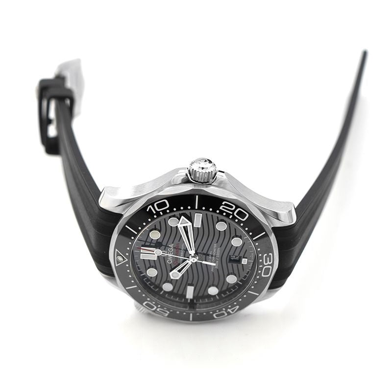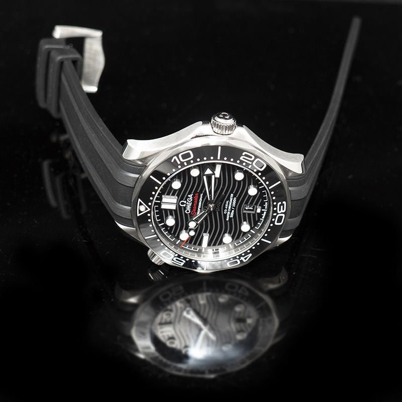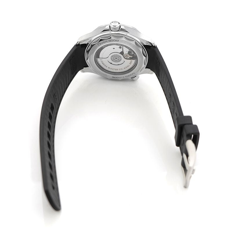 The OMEGA Seamaster Diver 300M has a bold, elegant, and striking design, which makes it one of the company's crown jewels. The 42mm case is crafted from stainless steel and topped with a black ceramic bezel that features a diving scale. The black dial has a wave pattern, skeleton hands, and raised indexes, while the helium escape valve is cone-shaped. The 210.32.42.20.01.001 watch is presented on a black rubber strap and has a wave-edged see-through caseback that showcases Omega calibre 8800 movement. Made for divers, this high-end men's timepiece can withstand up to 300 meters/1000 feet of water pressure.