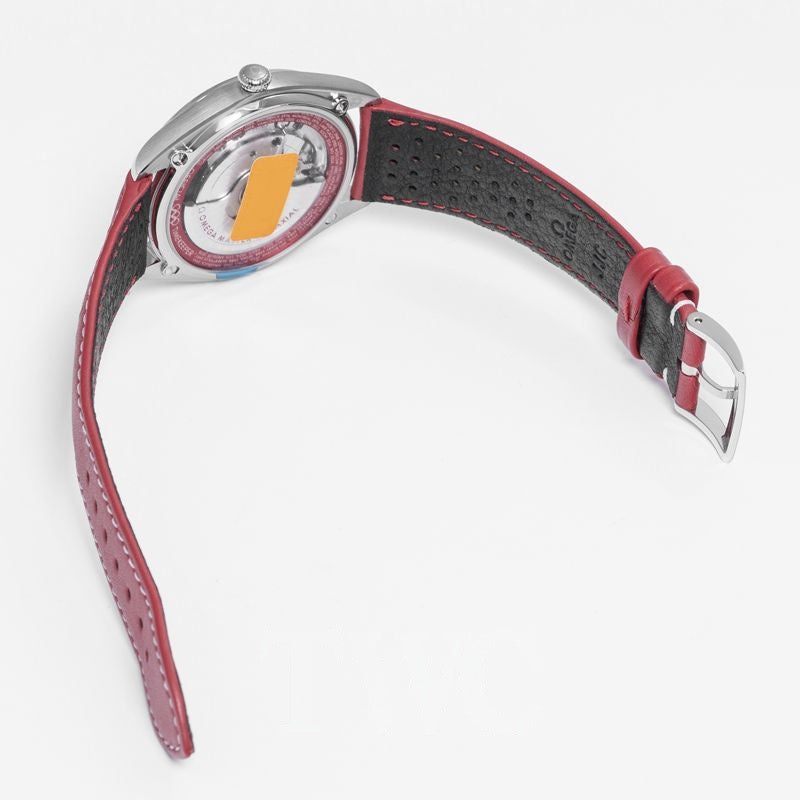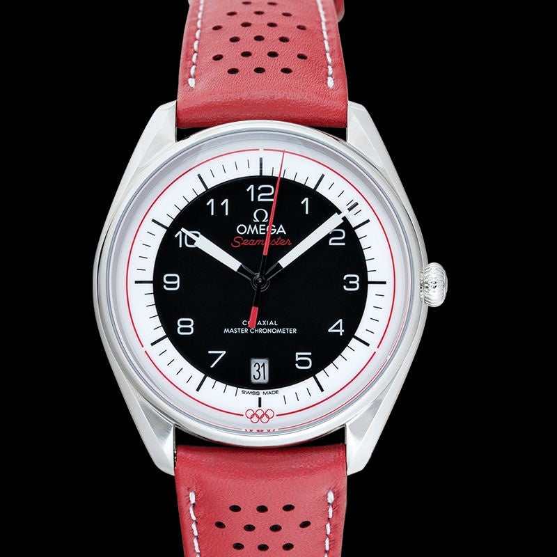 The OMEGA Seamaster Olympic Official Timekeeper is a stylish sports watch designed to pay homage to the company's long-lasting with the Olympic Games. This model has a 39.5mm stainless steel case and features a subtle red, micro-perforated leather strap that gives the 522.32.40.20.01.004 watch a playful and sporty touch. The black dial has white Arabic numerals and is completed with a white outer edge with black markers. The hour and minute hands are white with black bases while the second's hand is red and stands out. Powered by the Master Chronometer calibre 8800 only 2.032 units of this model have been manufacturers.
