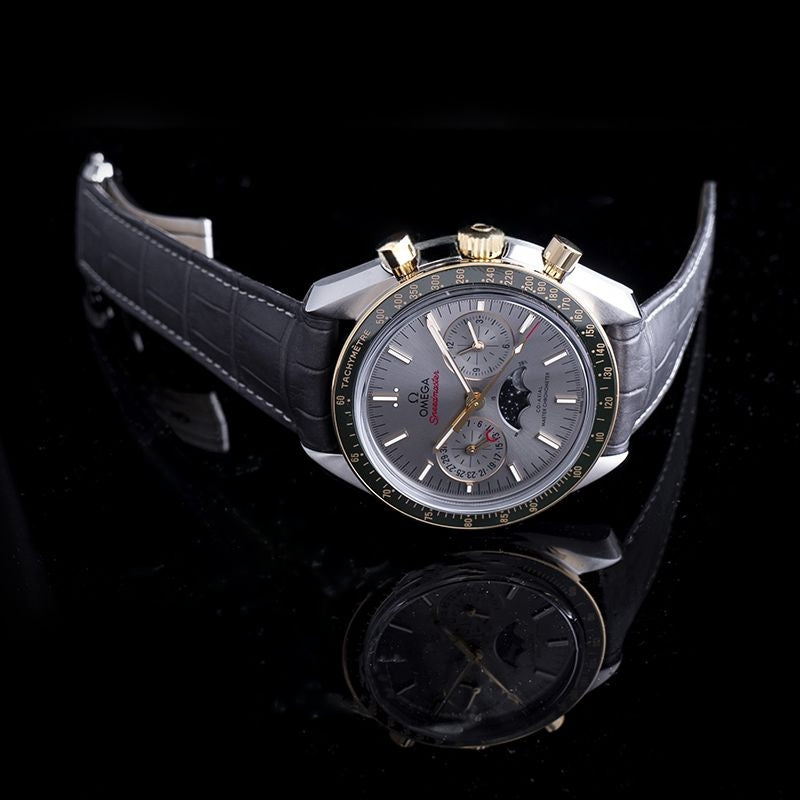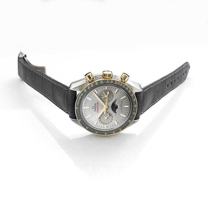 The OMEGA Speedmaster Moonwatch Co$$xial Master Chronometer Moonphase Chronograph 304.23.44.52.06.001 belongs to the legendary collection that has been to all six lunar missions. Filling the brand with pride is this new model with new Moonphase that integrates two small yet photo-realistic moons. Protected by an anti-reflective, scratch-resistant sapphire crystal is the grey sun-brushed dial. It includes two sub-dials, diamond-polished 18K yellow gold indices, and matching luminous hands. Above 6 o'clock position is the Moonphase indicator. Green ceramic bezel with Ceragold$$tachymeter scale gives the 44.25mm watch its final look, while it keeps running on the METAS-certified, OMEGA Co-Axial Master Chronometer 9904.