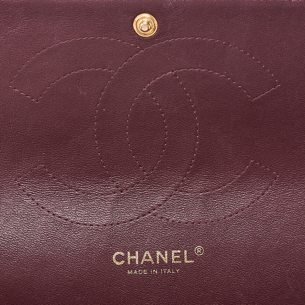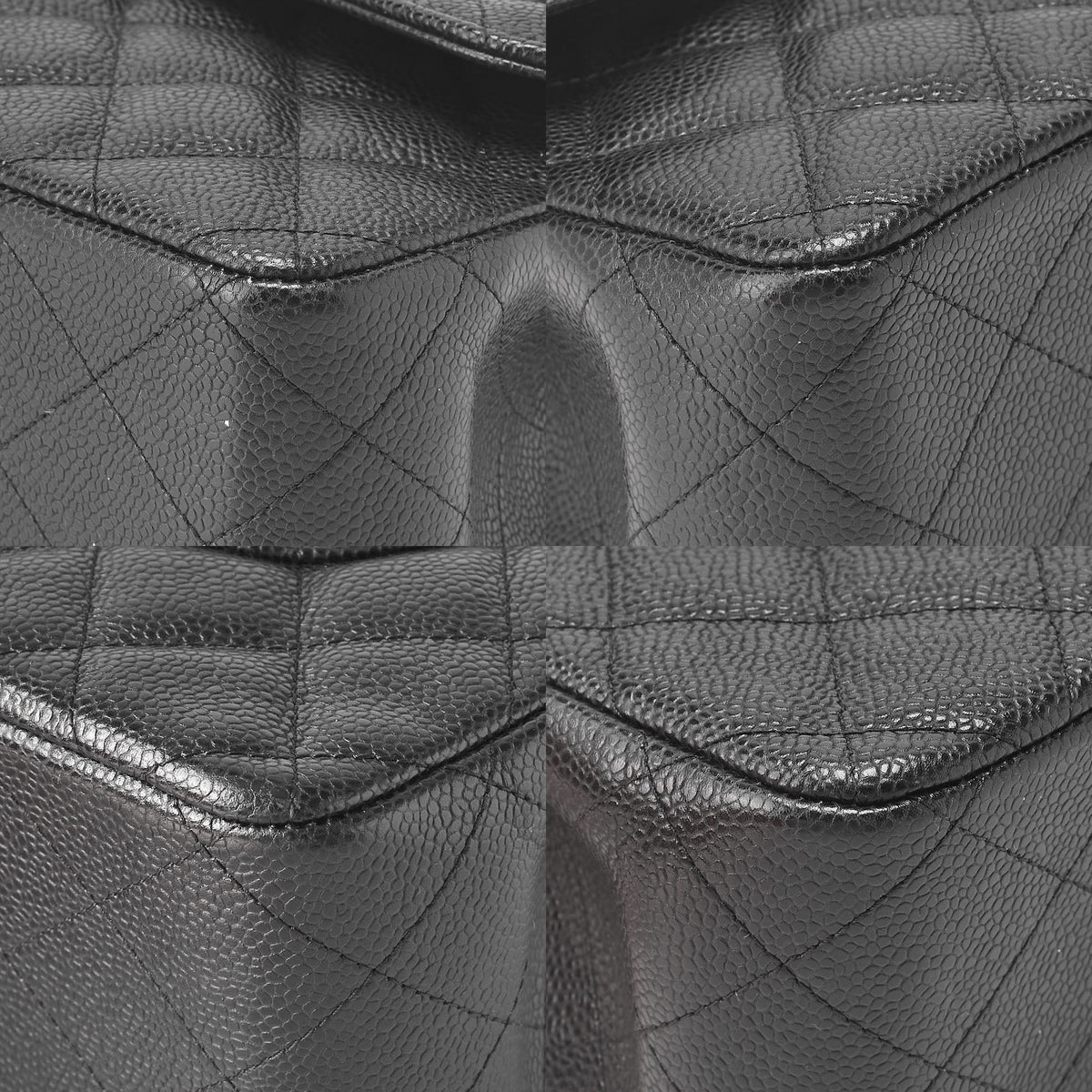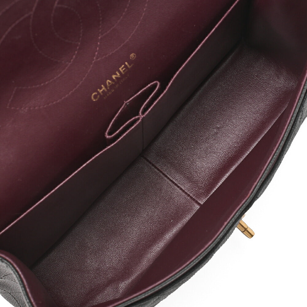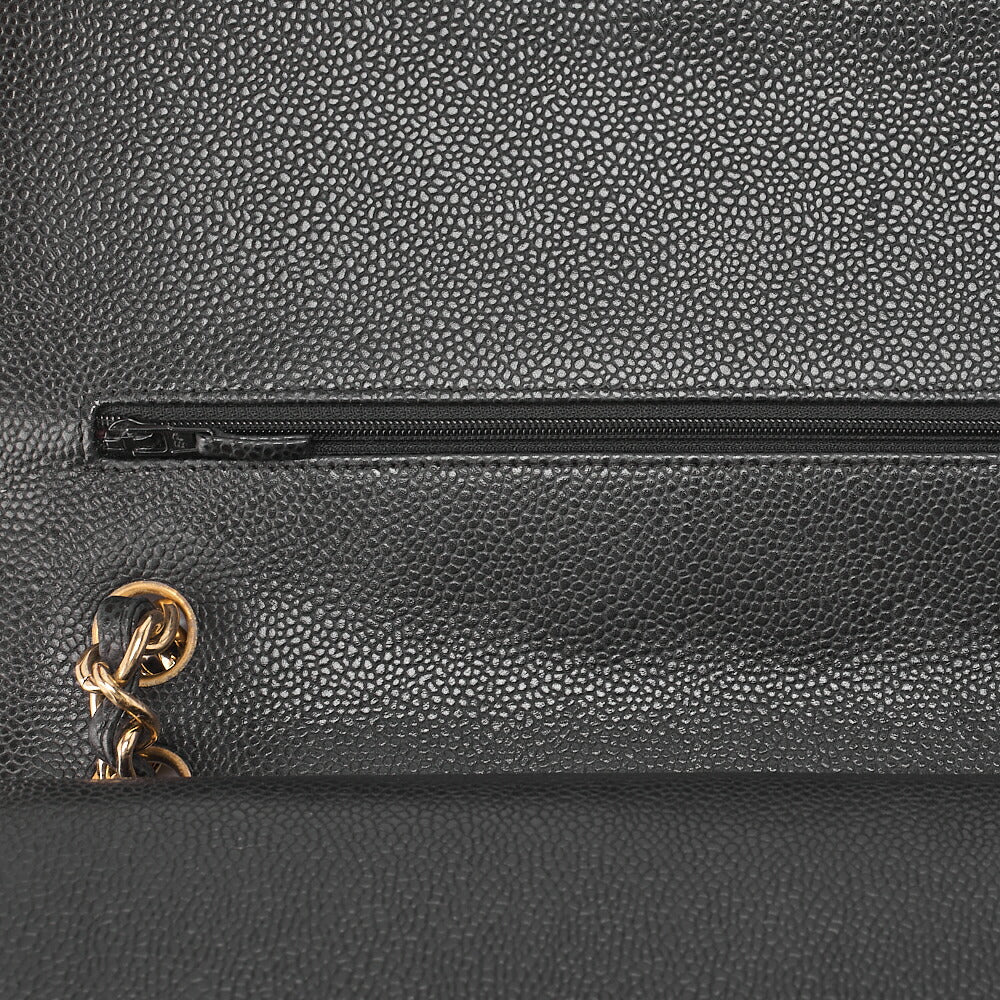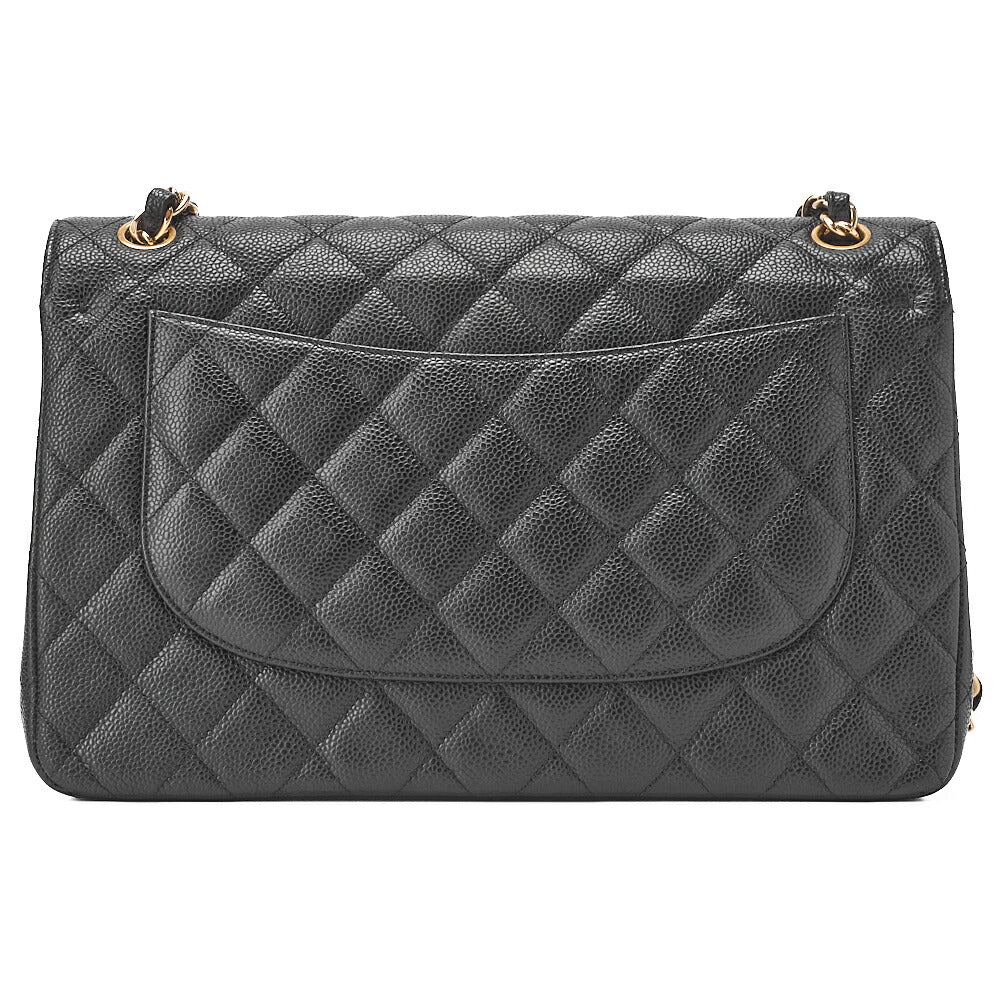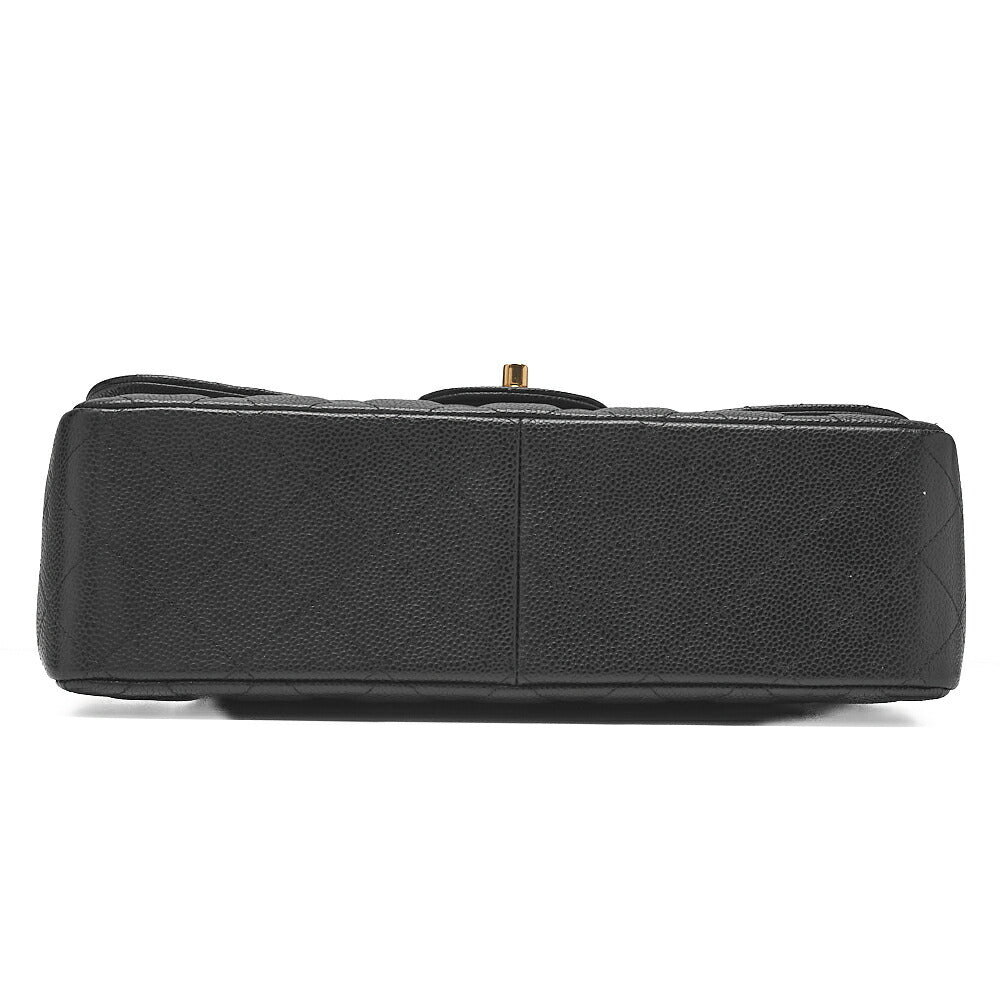Designed in black caviar skin with gold-tone hardware, this 30cm bag features the iconic matelassé quilting and a double-flap silhouette for a refined, versatile look.