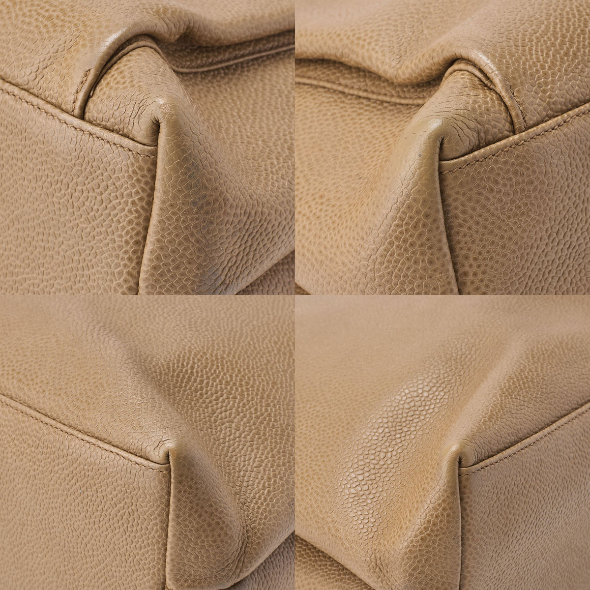 - Exterior: Caviar skin leather in Beige with gold-tone hardware.