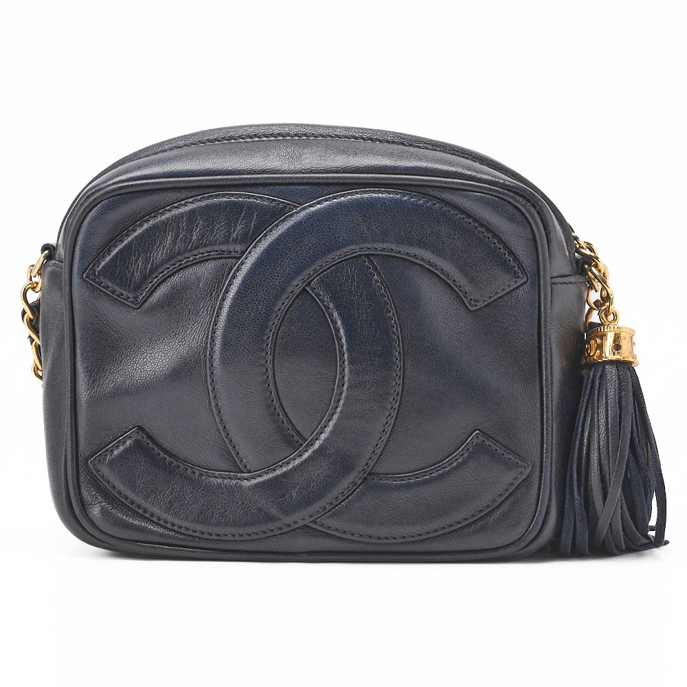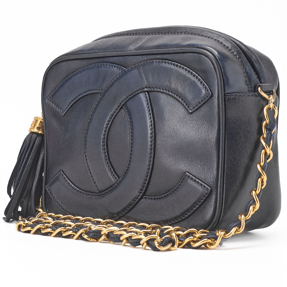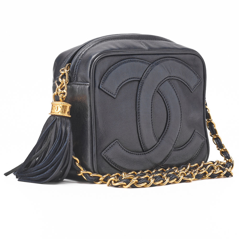 Pre-Owned Shoulder Bag, Coco Mark Fringe Chain Shoulder, Lambskin, Black, Gold-Tone Hardware, Pre-Owned