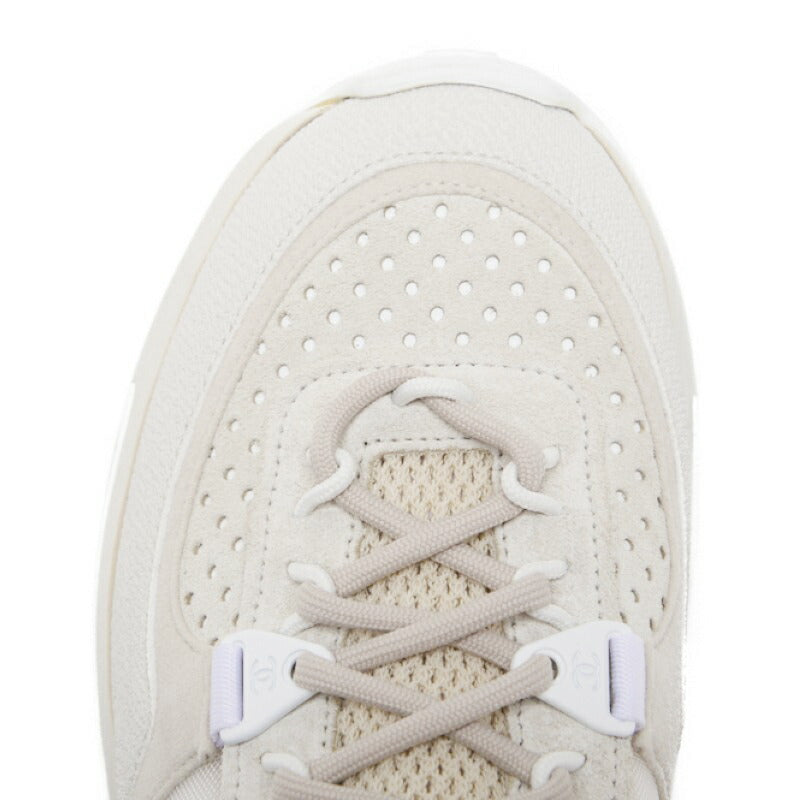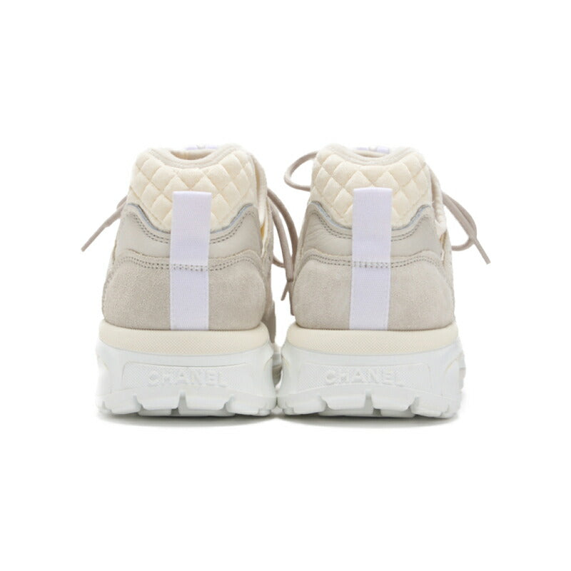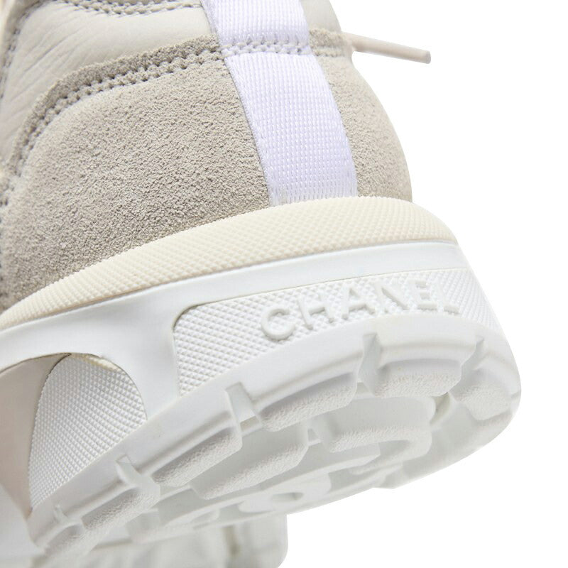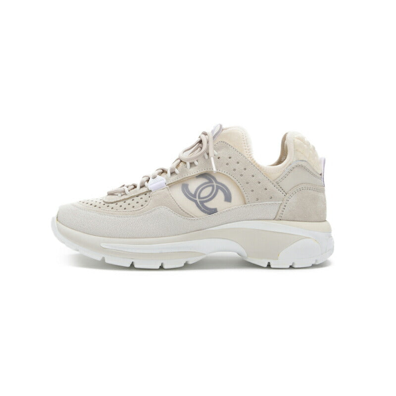 Discover the elegance of CHANEL Coco Mark Suede Sneakers in a sophisticated light gray and ivory colorway. Crafted from high-quality suede, these women's shoes are designed for both comfort and style. The unique combination of colors offers a versatile option for any wardrobe. With a size of 23-23.5 cm (UK 36.5), they are perfect for those seeking both fashion and functionality.