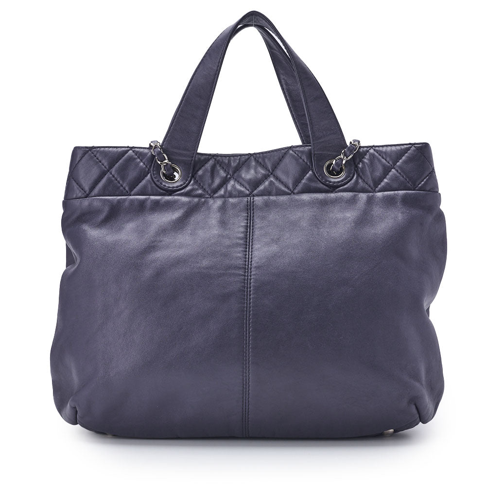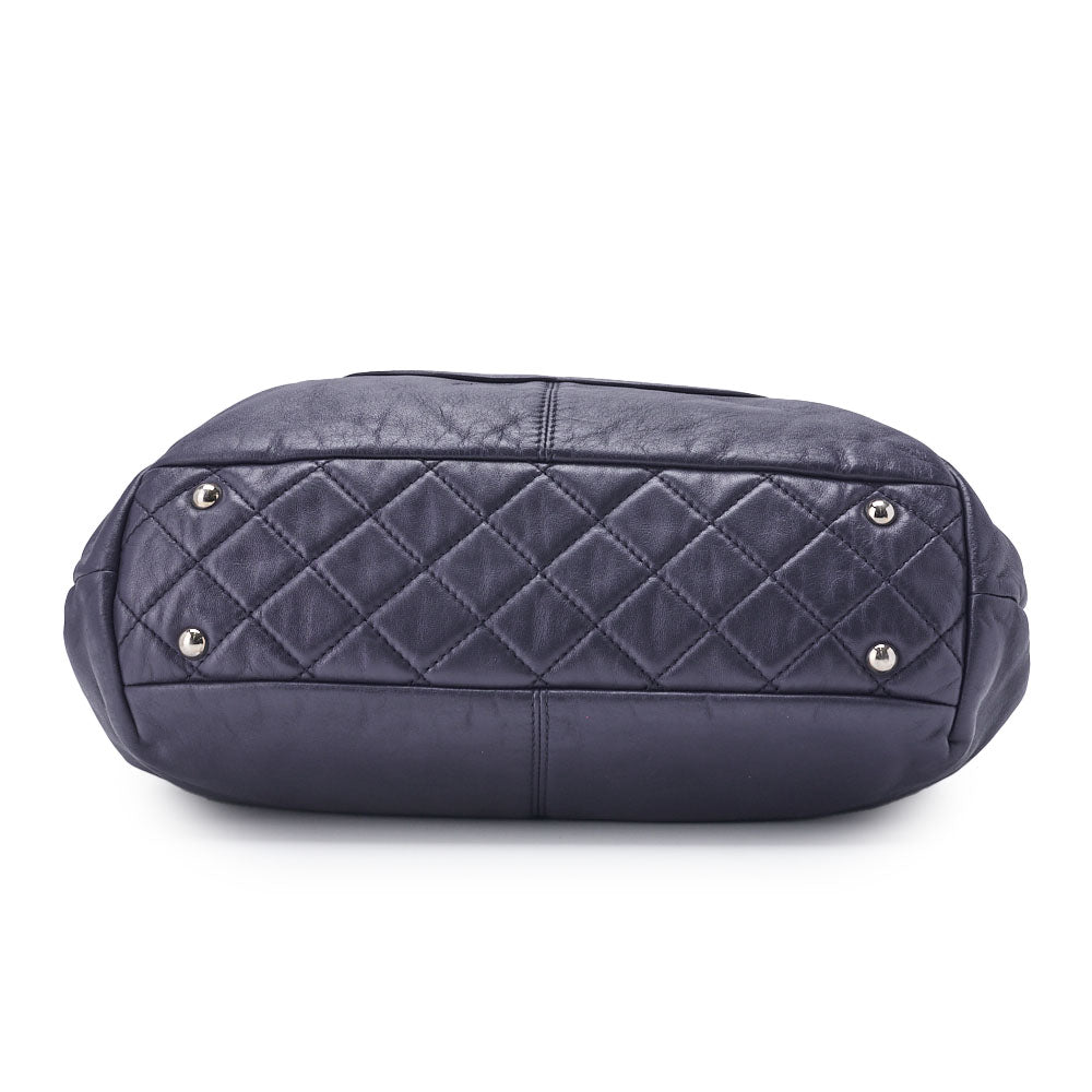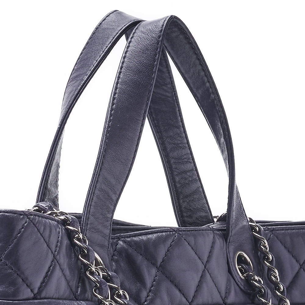 Introducing the exquisite CHANEL Matelasse Chain Shoulder Bag Tote, a luxurious accessory that effortlessly combines style and functionality. Crafted from premium lambskin leather, this stunning blue bag showcases the iconic Coco Mark, making it a timeless addition to any woman's wardrobe.