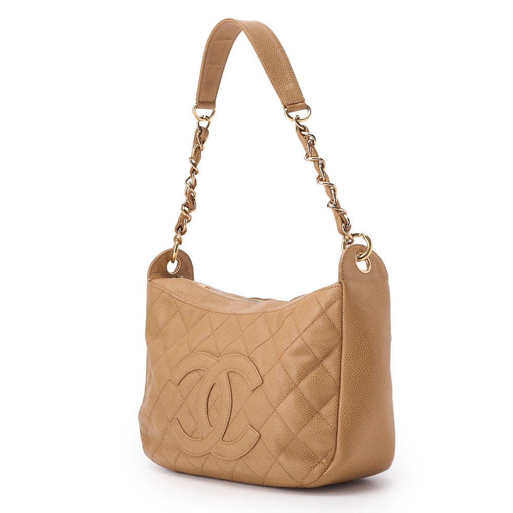 Indulge in luxury with the CHANEL Matelasse Coco Mark One Shoulder Bag crafted from exquisite Caviar Skin in a versatile beige shade, elegantly accented with gold fittings. This pre-owned gem is not just a bag; it’s a statement piece that epitomizes sophistication and style.