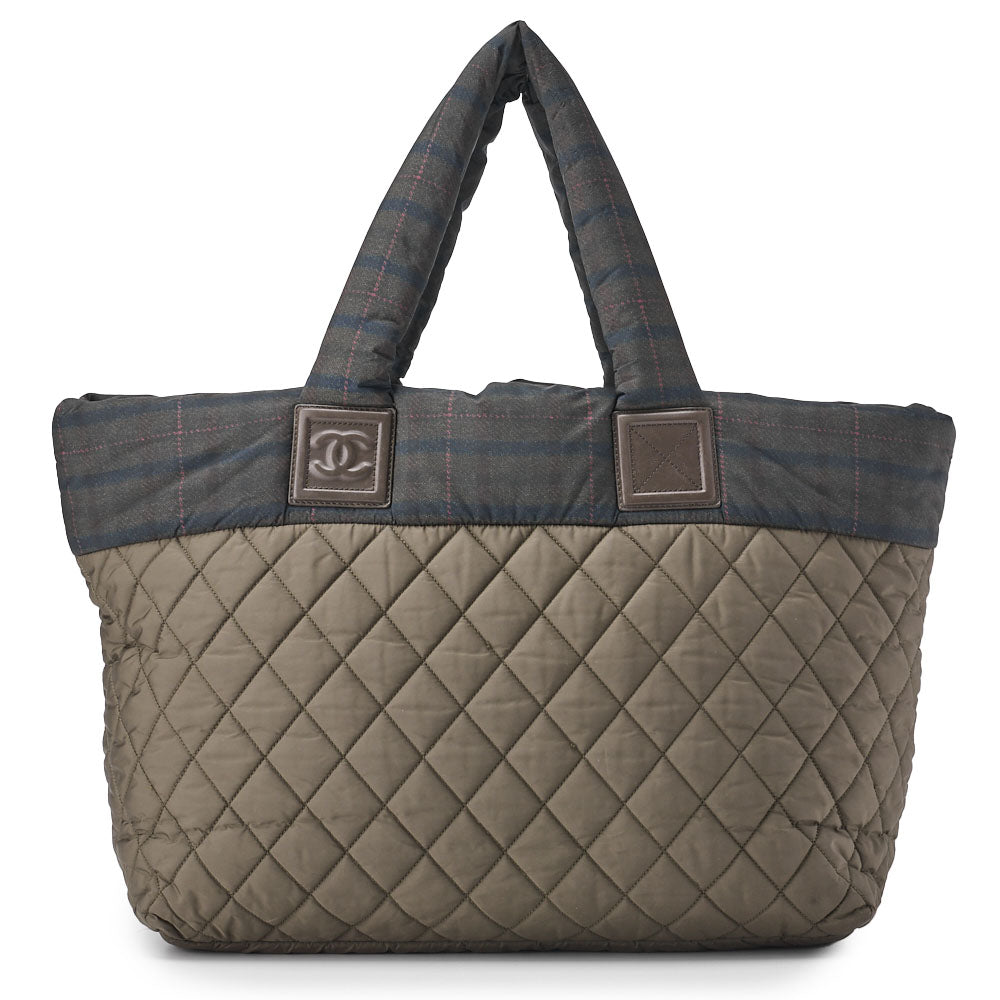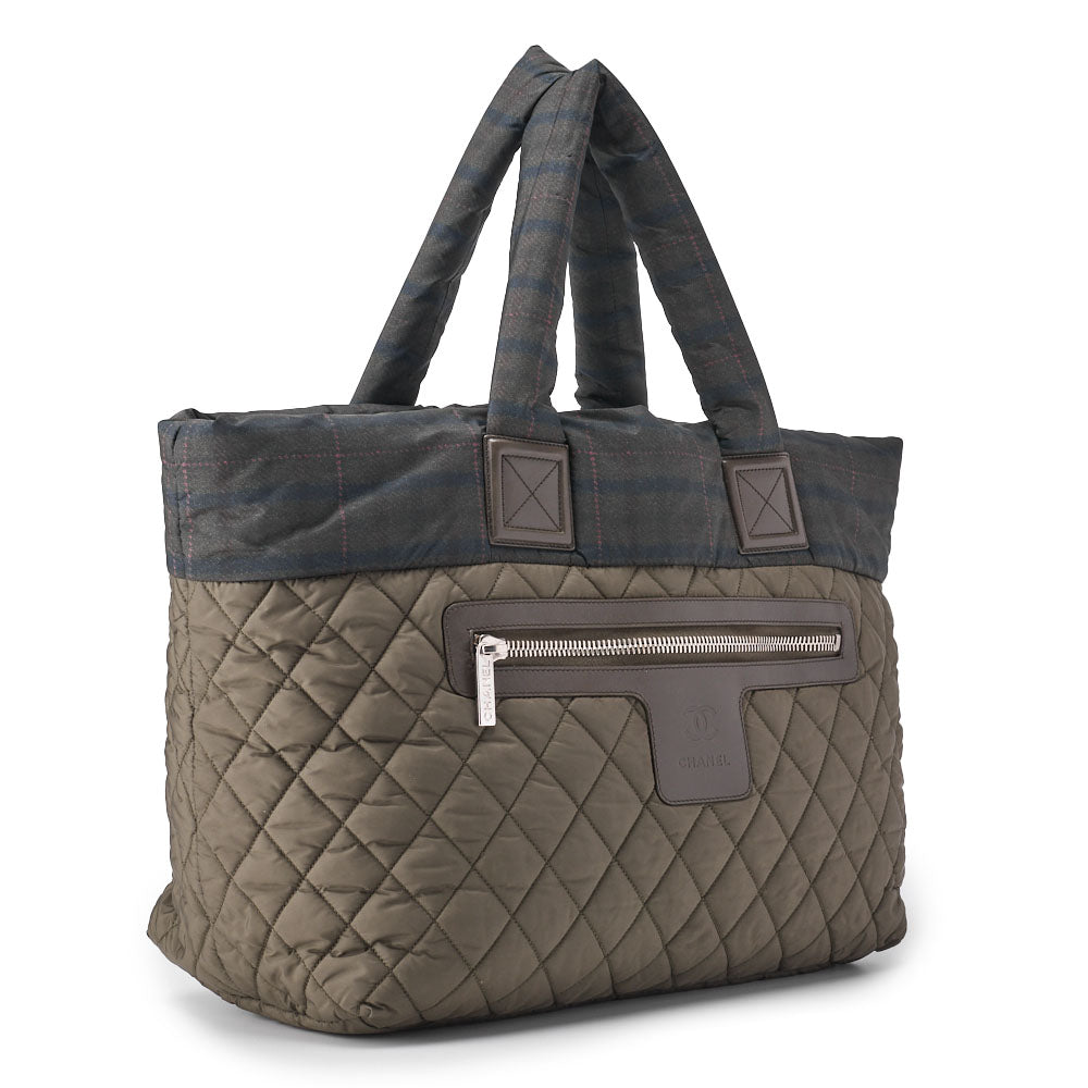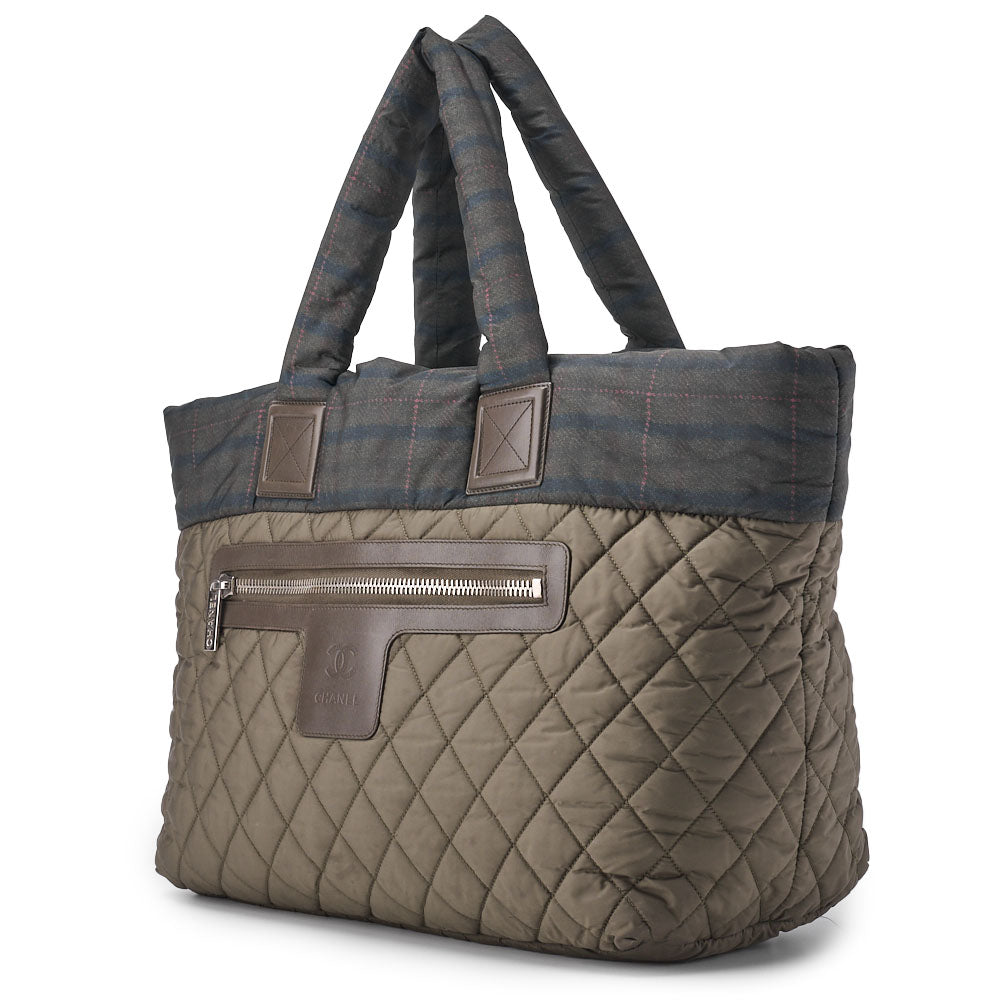 Discover the elegance and functionality of the CHANEL Matelasse Tote Bag with Silver Metal Fittings from the iconic Coco Cocoon collection. This large tote, crafted from durable nylon, is perfect for both everyday use and special occasions. Its stunning Glynn color, complemented by chic silver fittings, makes it a timeless addition to your accessory collection.
