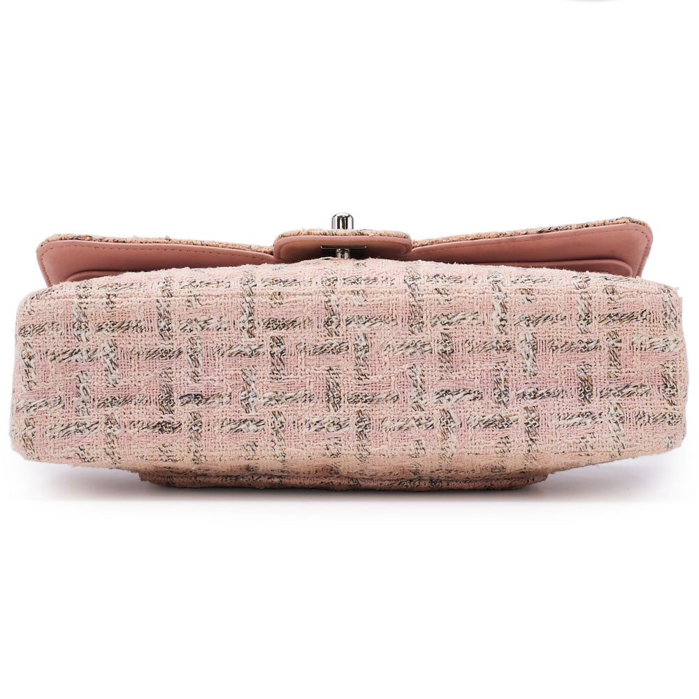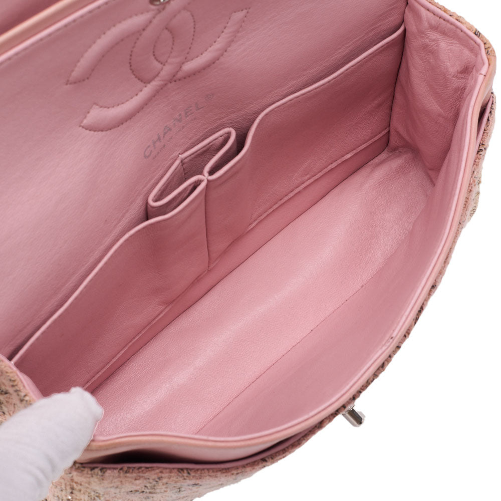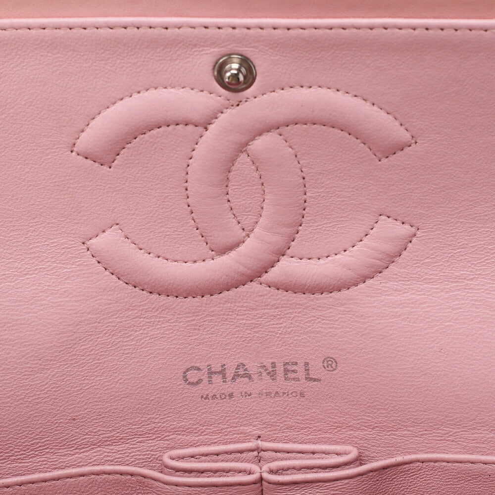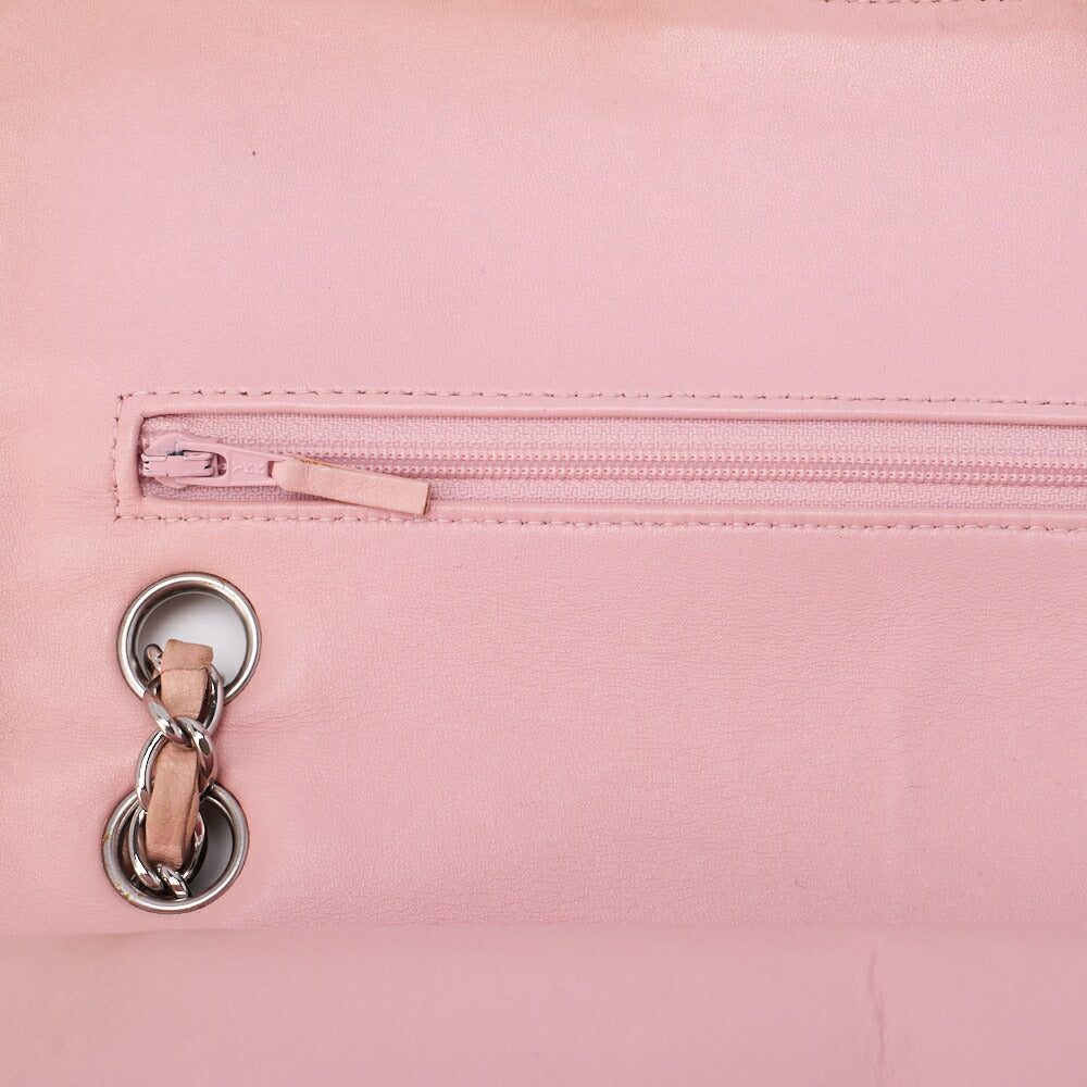 Elevate your style with the exquisite CHANEL Matelasse Turn Lock Double Flap 25 Chain Shoulder Bag in a stunning jersey pink hue, accented by elegant silver fittings. This iconic piece is not just a handbag; it's a statement of sophistication and luxury.
