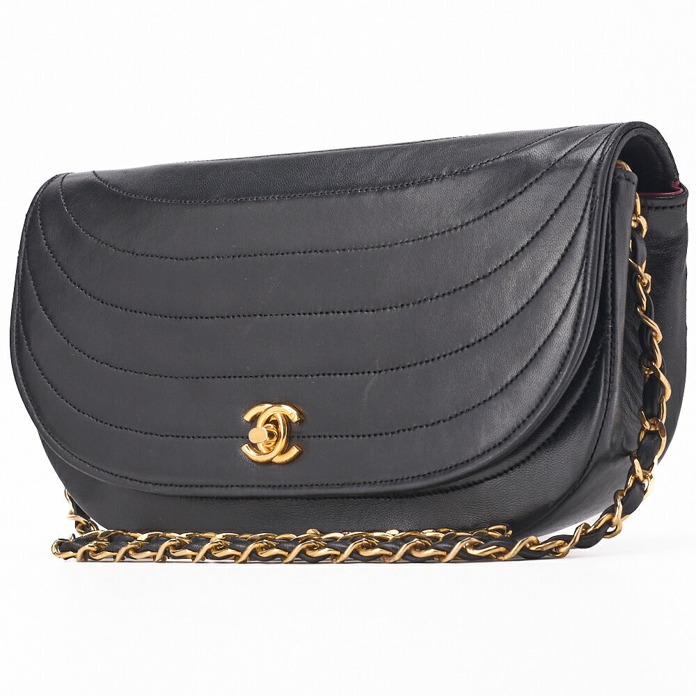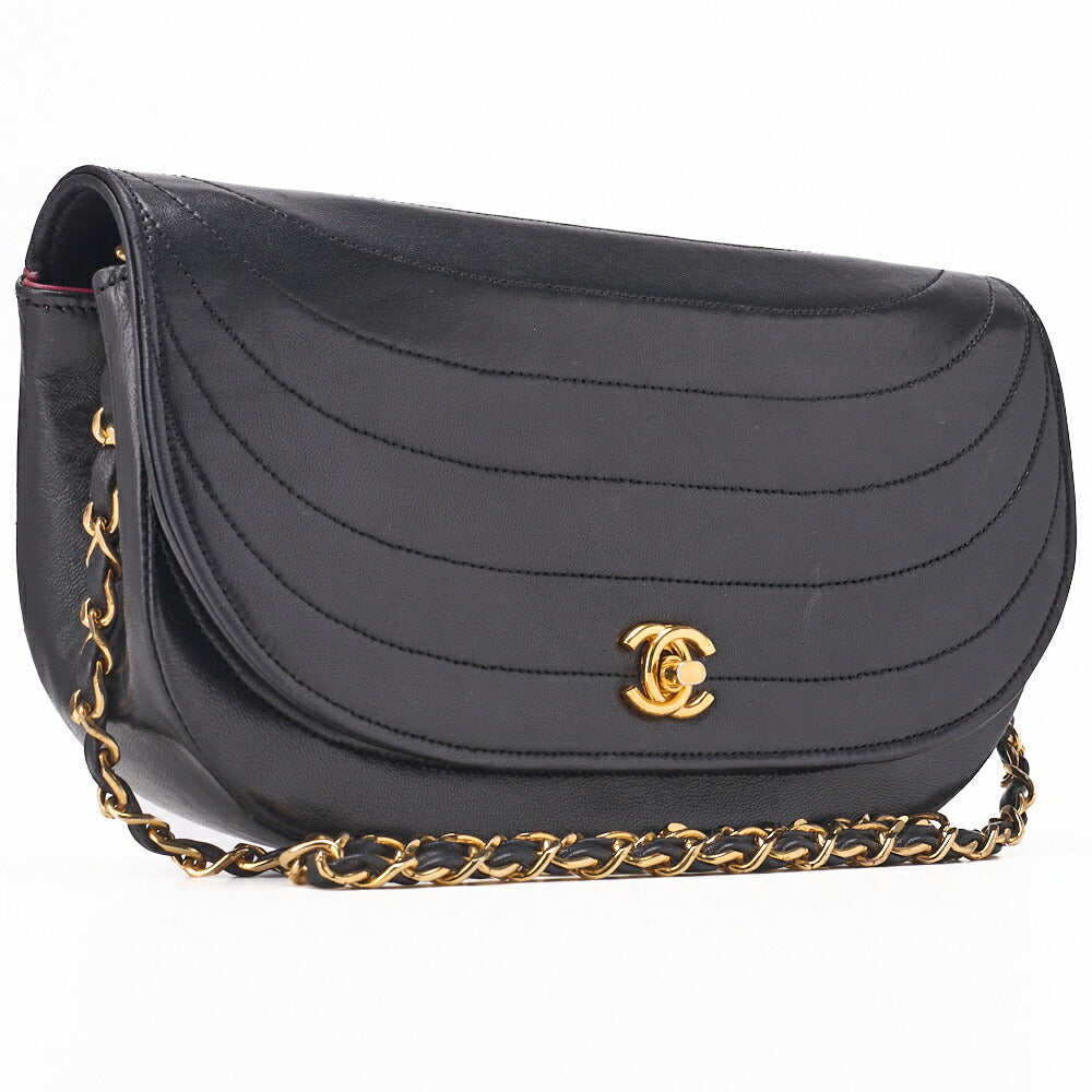 Elevate your style with the exquisite CHANEL Shoulder Bag Border Stitch Half Moon, a perfect fusion of luxury and functionality. Crafted from sumptuous lambskin leather, this stunning black bag features elegant gold metal fittings that beautifully contrast against its rich texture, making it a timeless addition to any wardrobe.