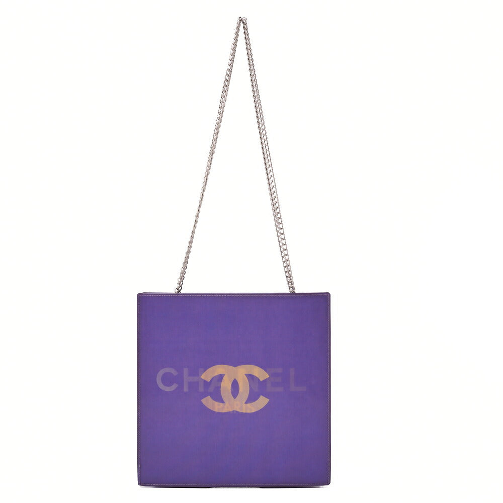 Elevate your style with the CHANEL Chanel Shoulder Bag, featuring the iconic Coco Mark Logo in a stunning hologram finish. This exquisite women's bag is crafted from durable vinyl in a captivating purple hue, adorned with silver metal fittings that add a touch of elegance. Measuring approximately 20cm x H20cm x D4cm, it is perfectly sized to carry your essentials while making a chic statement.