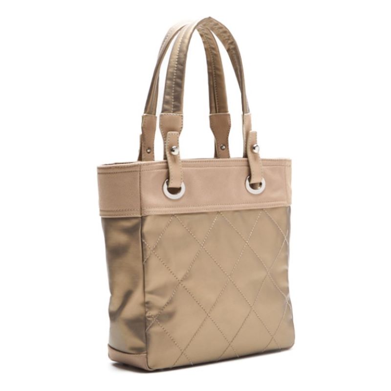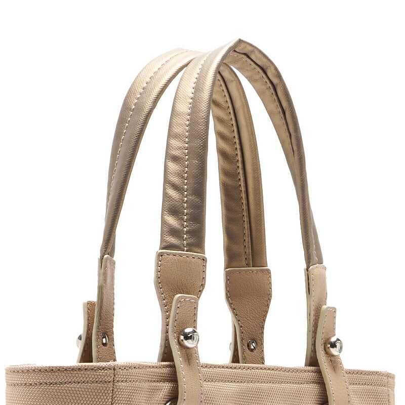 Crafted from high-quality coated canvas, this bag features a rich gold color complemented by silver metal fittings, ensuring you make a statement wherever you go. With dimensions of approximately W25cm x H27cm x D11cm and a hand length of about 47cm, it strikes the perfect balance between spaciousness and compactness.