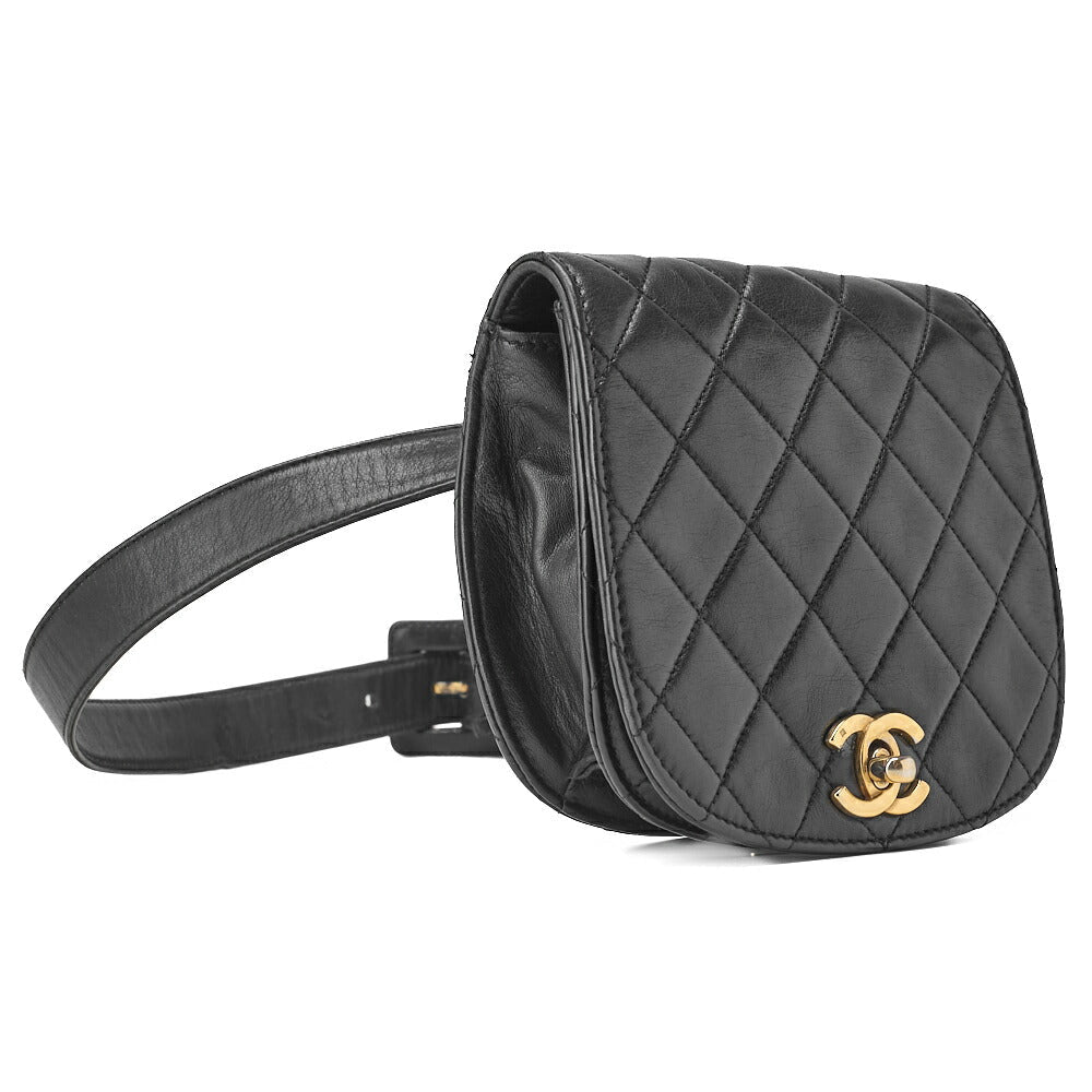 Elevate your style with the exquisite CHANEL Shoulder Bag Tote Bag Matelasse Turn Lock Waist Bag, crafted from luxurious lambskin in a striking black hue complemented by elegant gold metal fittings. This chic bag is not just an accessory; it's a statement piece that embodies sophistication and versatility.