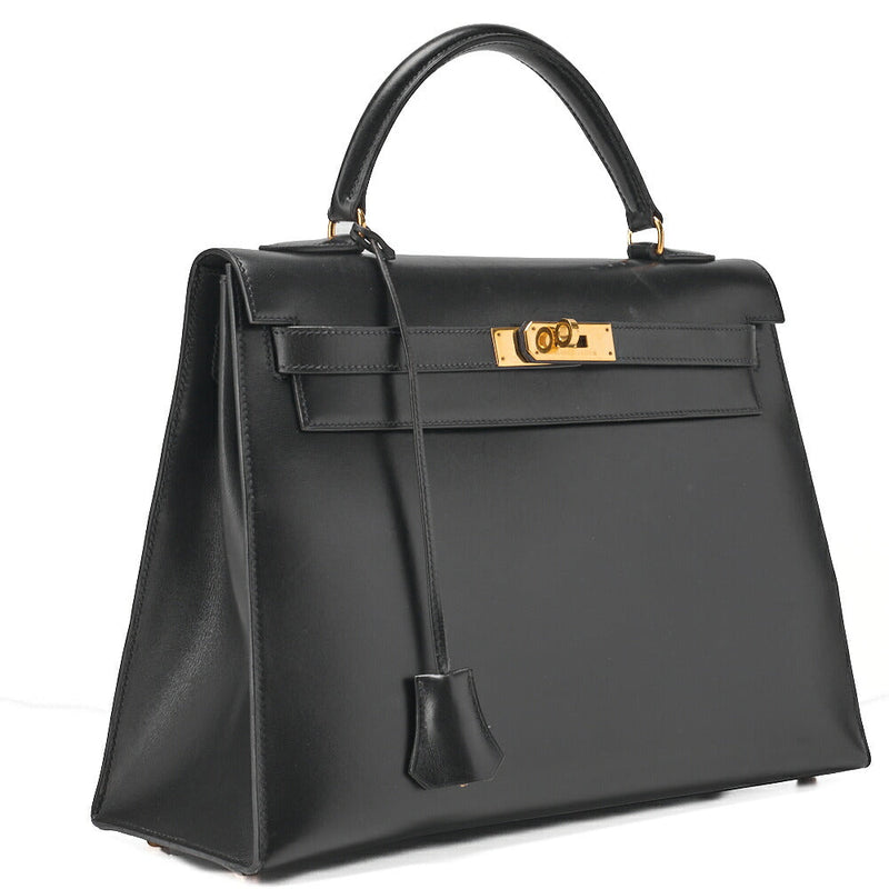 Pre-Owned Kelly 32 Handbag Box Calf Black Black Exterior Stitching Gold-Tone Hardware, Pre-Owned