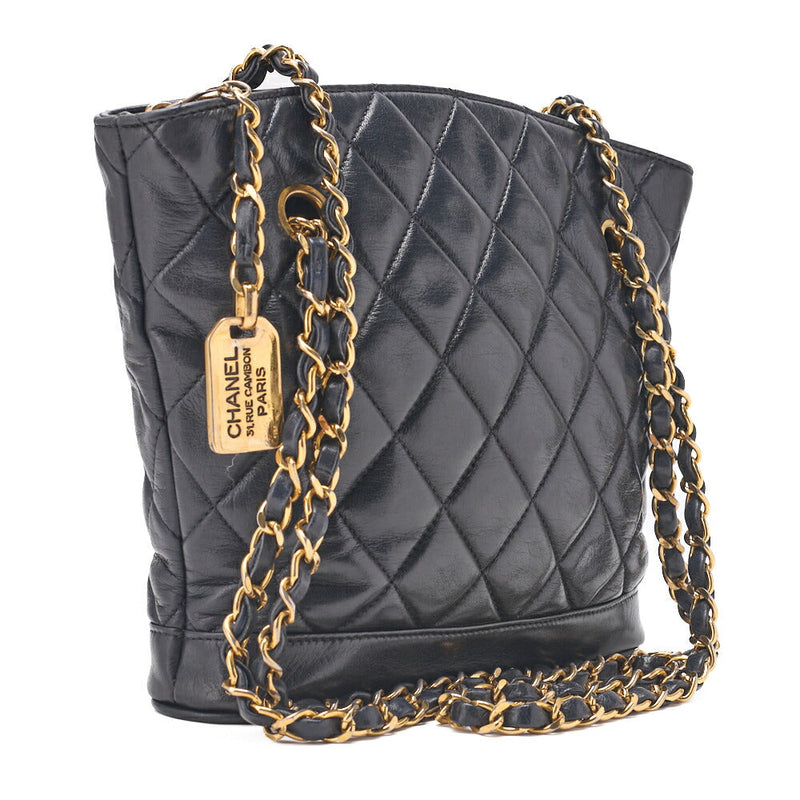Pre-Owned Shoulder Bag Matelasse Plate Charm Fan Shaped Chain Shoulder Lambskin Navy Gold-Tone Hardware, Pre-Owned