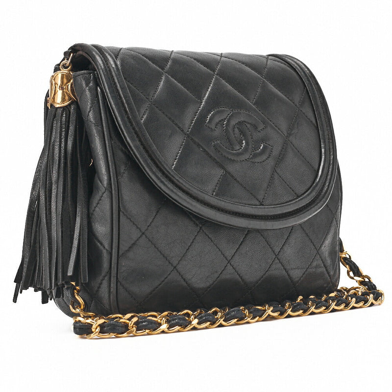 Pre-Owned Shoulder Bag Matelasse Outside Flap Fringe Chain Shoulder Lambskin Black Gold-Tone Hardware Pre-Owned