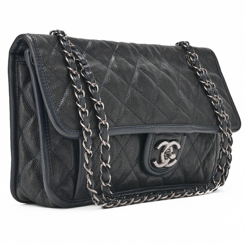 Pre-Owned Chain Shoulder Bag Matelassé Single Flap Turnlock Caviar Skin Navy Silver-Tone Hardware, Pre-Owned