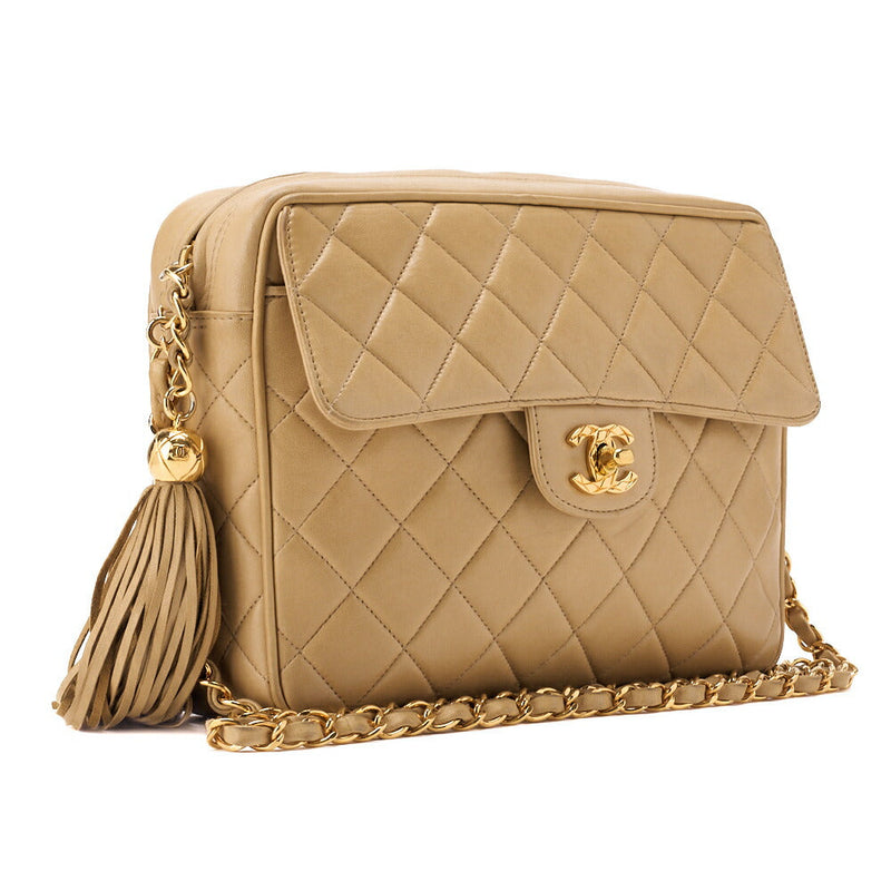 Pre-Owned Shoulder Bag, Matelasse Outside Flap Fringe, Lambskin, Beige, Gold-Tone Hardware, Pre-Owned