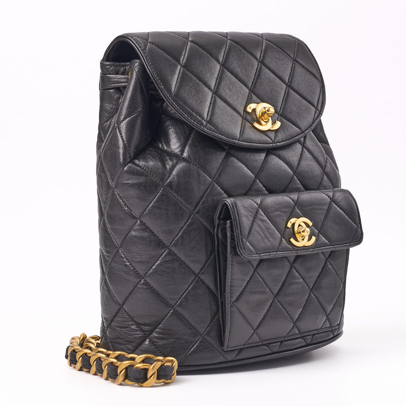 Pre-Owned Chain Backpack Bag Matelasse Outside Flap Turn Lock Lambskin Black Gold-Tone Hardware Pre-Owned