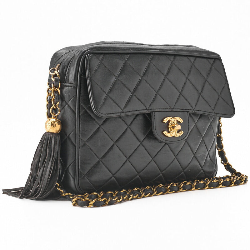 Pre-Owned Shoulder Bag Matelasse Outside Flap Fringe Chain Shoulder Lambskin Black Gold-Tone Hardware Pre-Owned