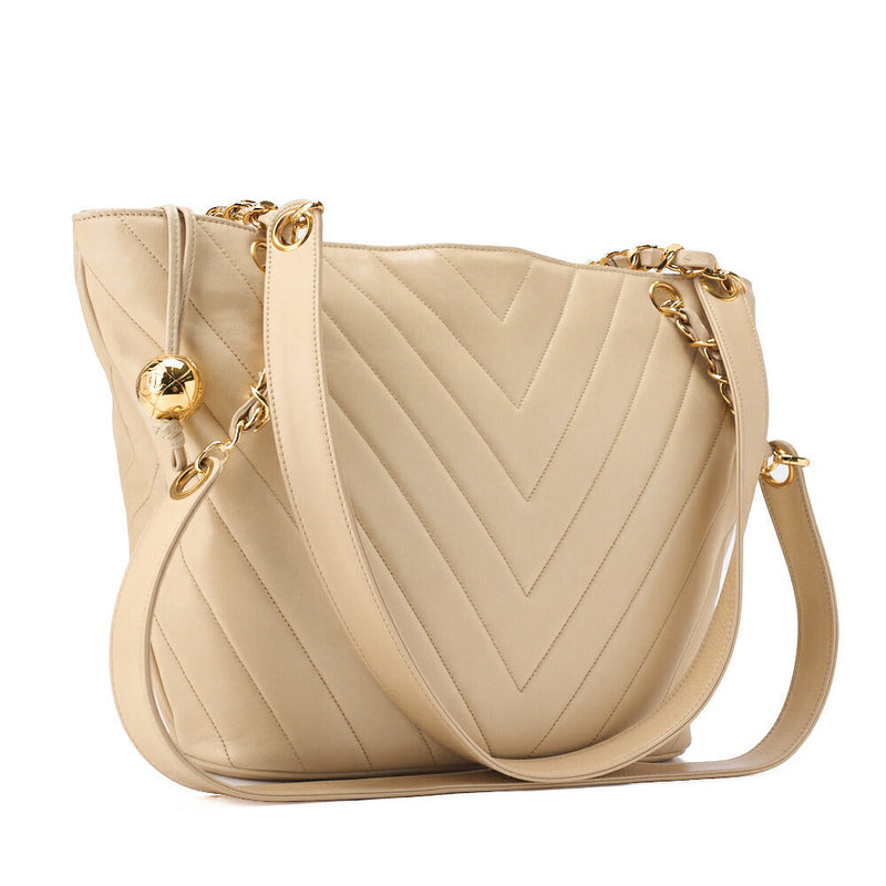 Pre-Owned V-Stitch Ball Charm Chain Shoulder Bag Lambskin Beige Gold-Tone Hardware, Pre-Owned