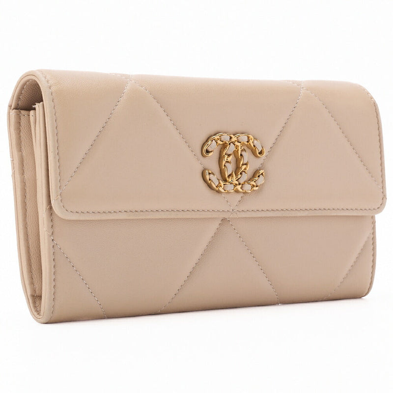 Pre-Owned 19 Bi-fold Long Wallet Matelasse Lambskin Beige Gold-Tone Hardware Pre-Owned