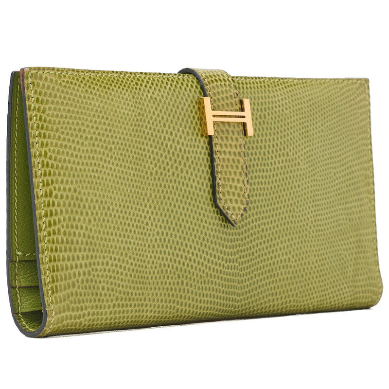 Pre-Owned Béance Souffle 2 Fold Long Wallet Lizard Anisegrin Anis green Gold-Tone Hardware, Pre-Owned