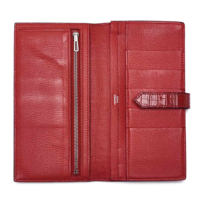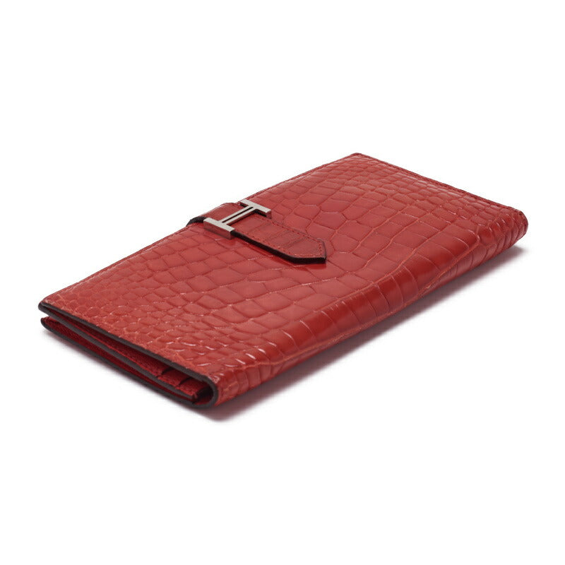 Indulge in the luxurious allure of the HERMES Hermes Bearn Soufflet 2 Fold Long Wallet. Crafted from sumptuous alligator leather in a striking Blaze Raise hue, this wallet is not just an accessory; it is a statement piece that embodies elegance and sophistication.