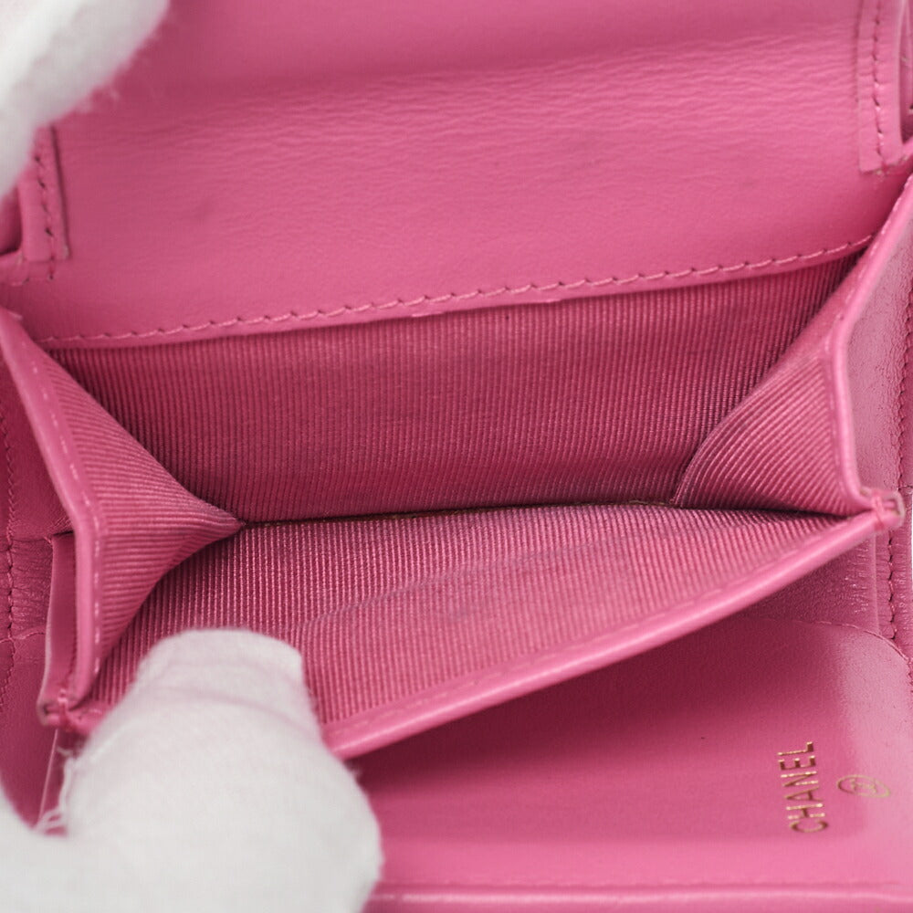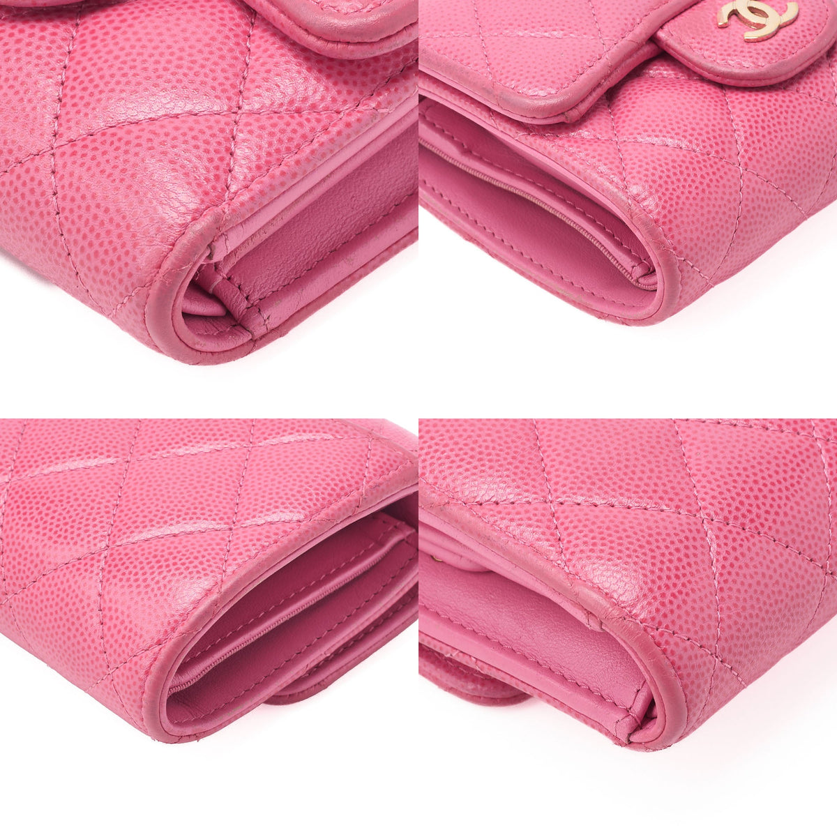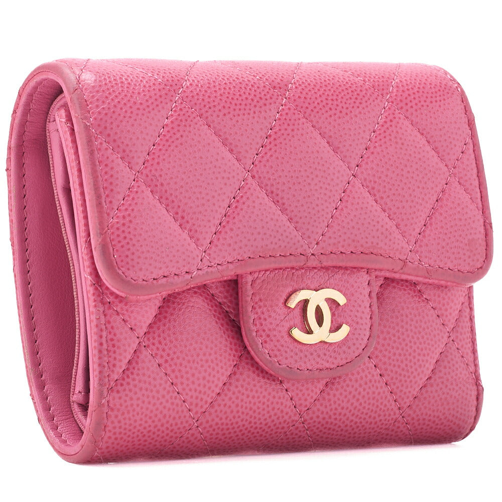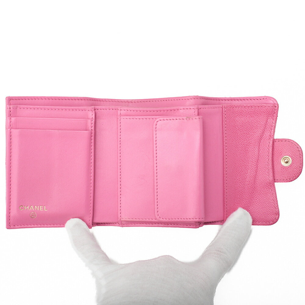 Introducing the exquisite CHANEL Matelasse Tri-fold Compact Wallet, a luxurious accessory crafted from premium Caviar Skin in a stunning Pink hue, elegantly accented with Gold Hardware. This pre-owned women's wallet purse effortlessly combines style and functionality, making it a perfect addition to your collection. With dimensions of approximately W10.5cm x H9cm, it's compact yet spacious enough to hold your essentials.