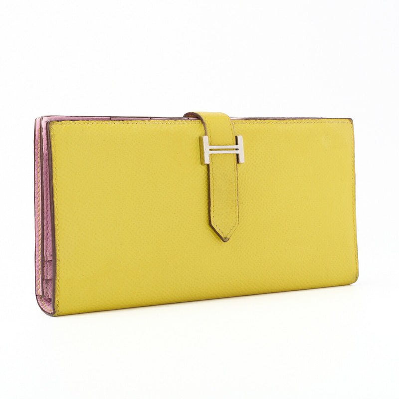 Pre-Owned Bearn Soufflet Two-Fold Long Wallet Bicolor Vaux Epson Yellow Silver-Tone Hardware Pre-Owned