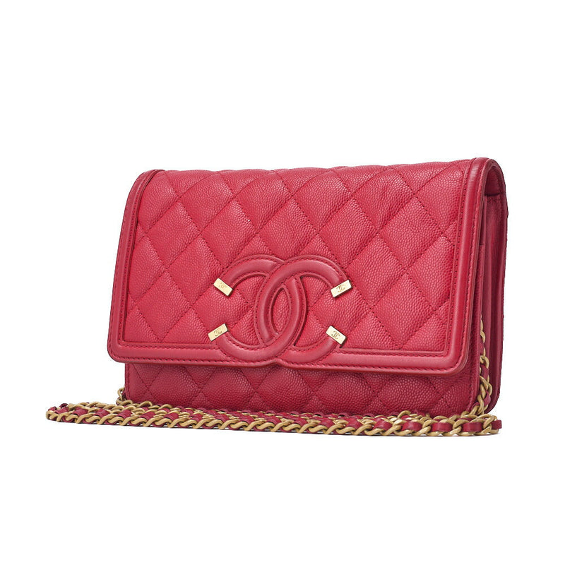 Pre-Owned Shoulder Bag Chain Wallet Matelasse Caviar Skin Red Gold-Tone Hardware Pre-Owned