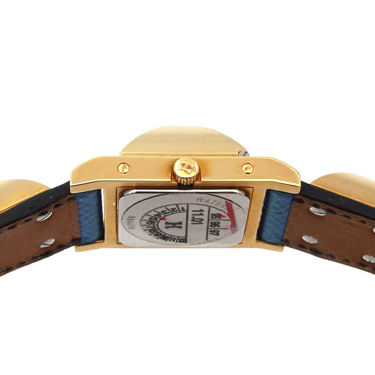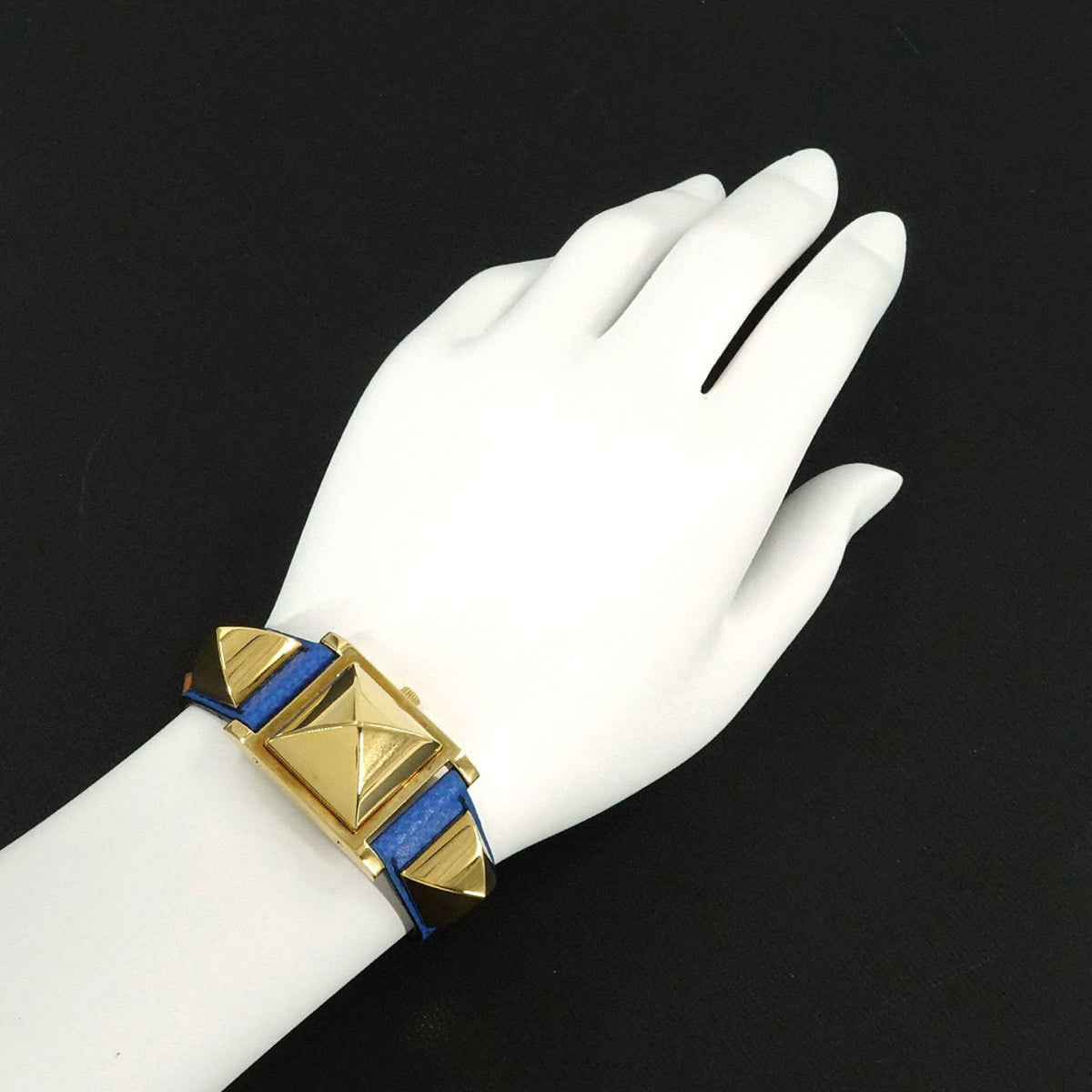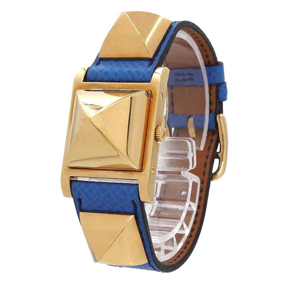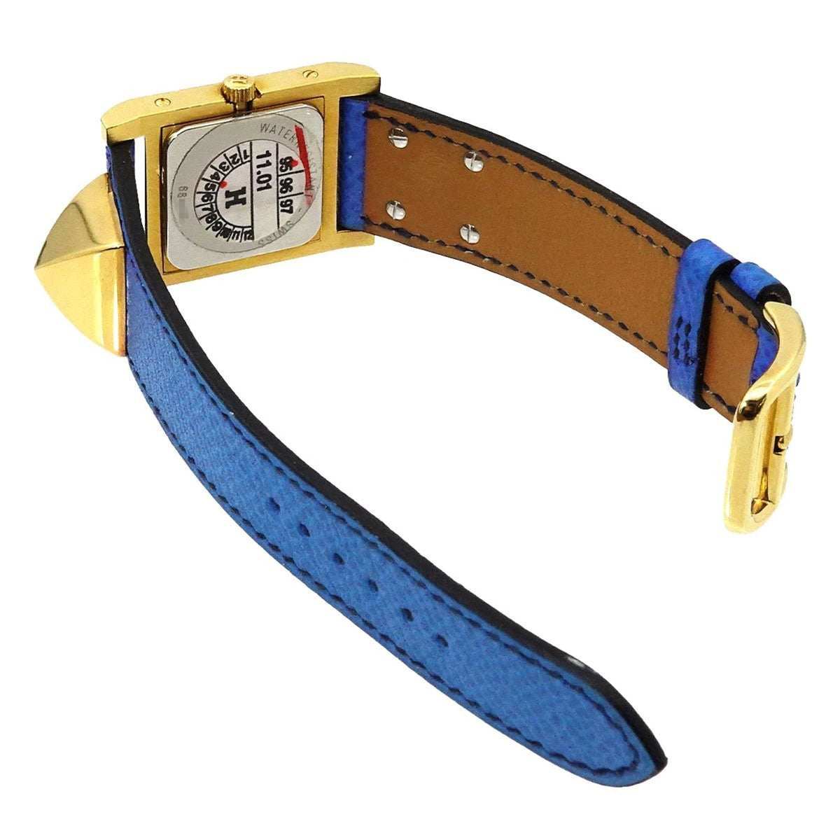 Pre-Owned Herm?s Medor Women's Pyramid Gold Stud Watch with White and Blue Leather Quartz Movement