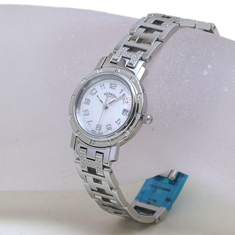 Pre-Owned HERMES Clipper Nakreh (old buckle) women's watch CL4.230.215 3869 with 12 diamond bezel and bracelet in stainless steel (40047)