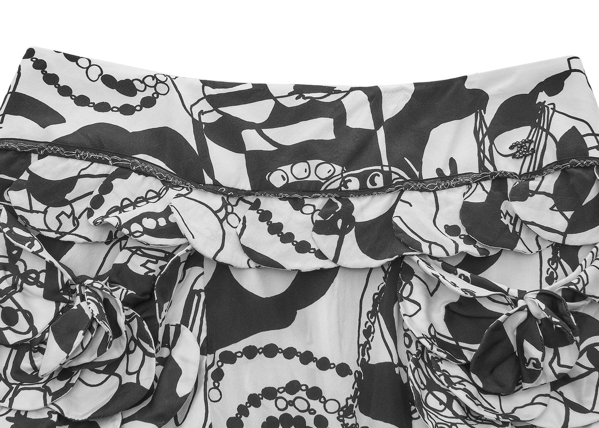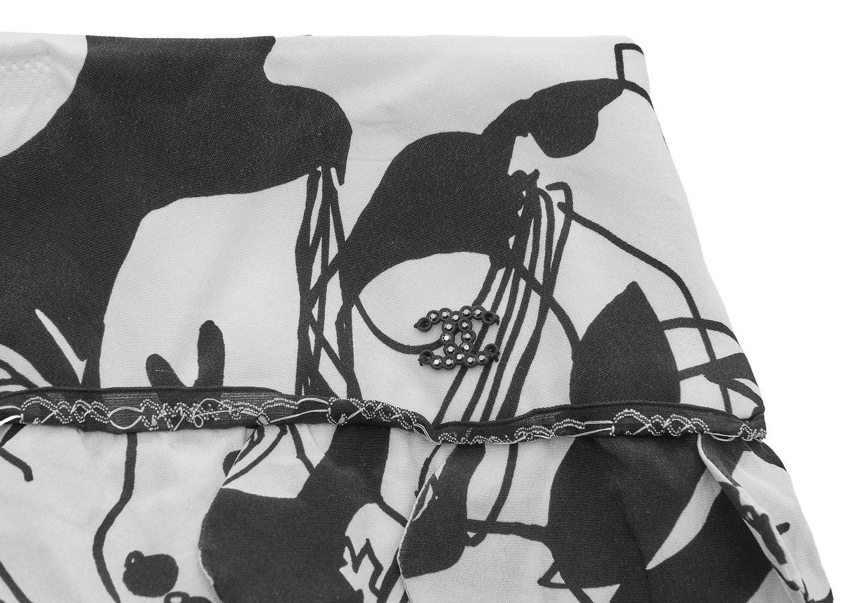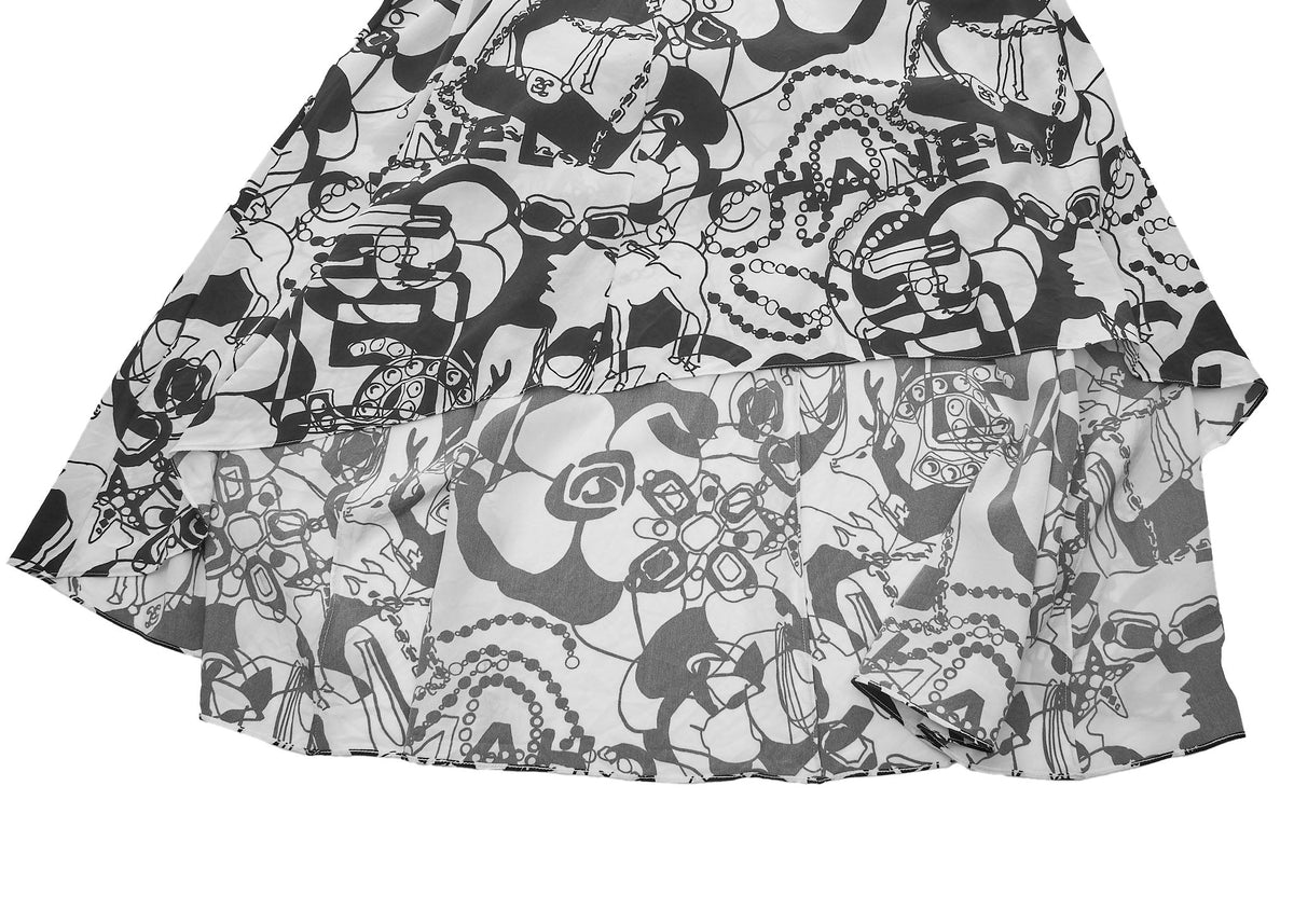 Elevate your wardrobe with the stunning CHANEL Camellia Coco Mark Logo Skirt 36 Black & White. This exquisite long skirt showcases the iconic CHANEL Camellia logo, a symbol of timeless elegance and luxury. Crafted from 100% silk, it offers a soft, flowing silhouette that beautifully drapes around your figure.