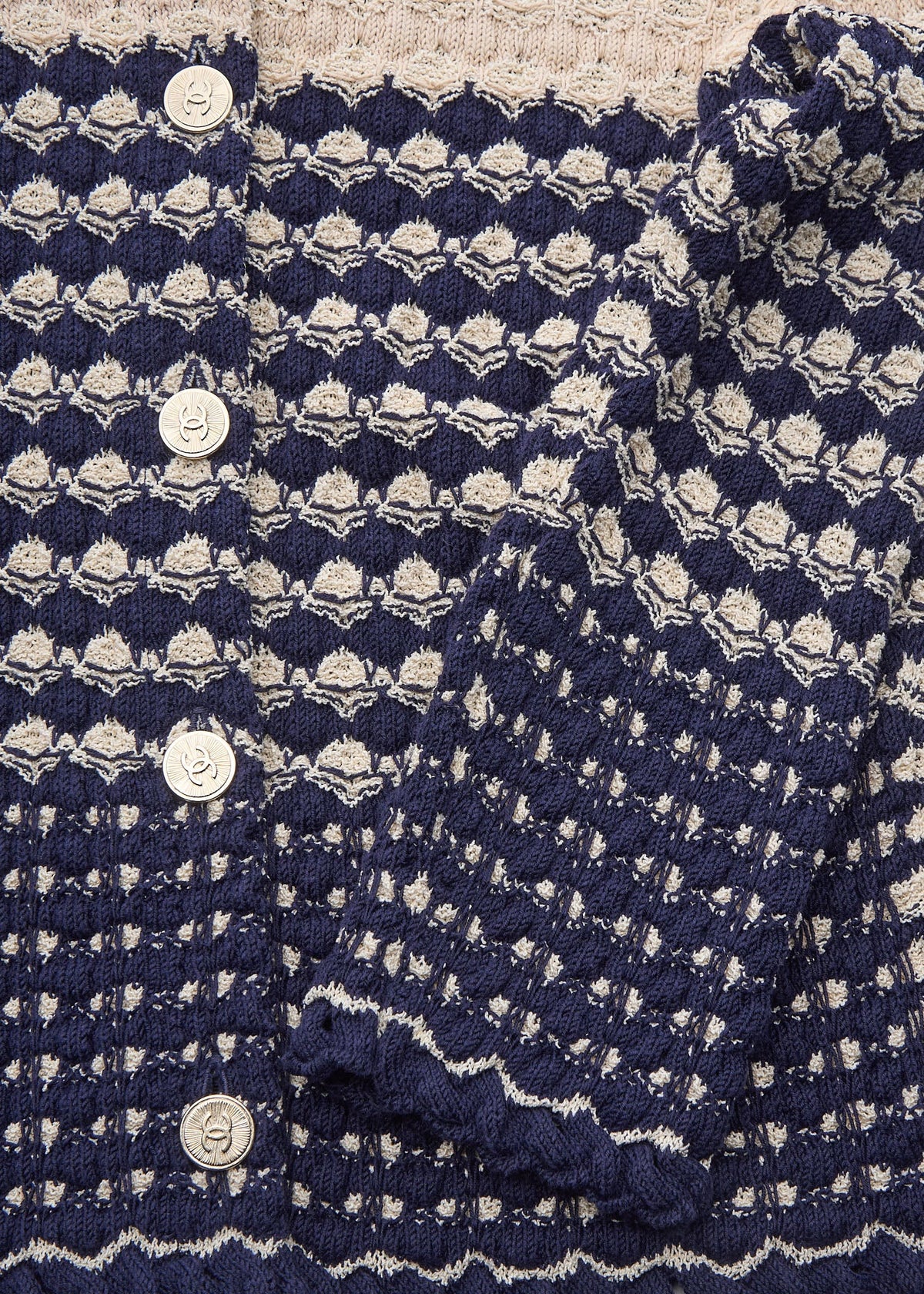 Crafted from a luxurious blend of 40% rayon, 30% cotton, 24% silk, and 3% other materials, this cardigan promises a soft touch and a cozy fit. The elegant beige and navy color combination adds a classic flair, while the knit design enhances its versatility, allowing it to be dressed up or down effortlessly.