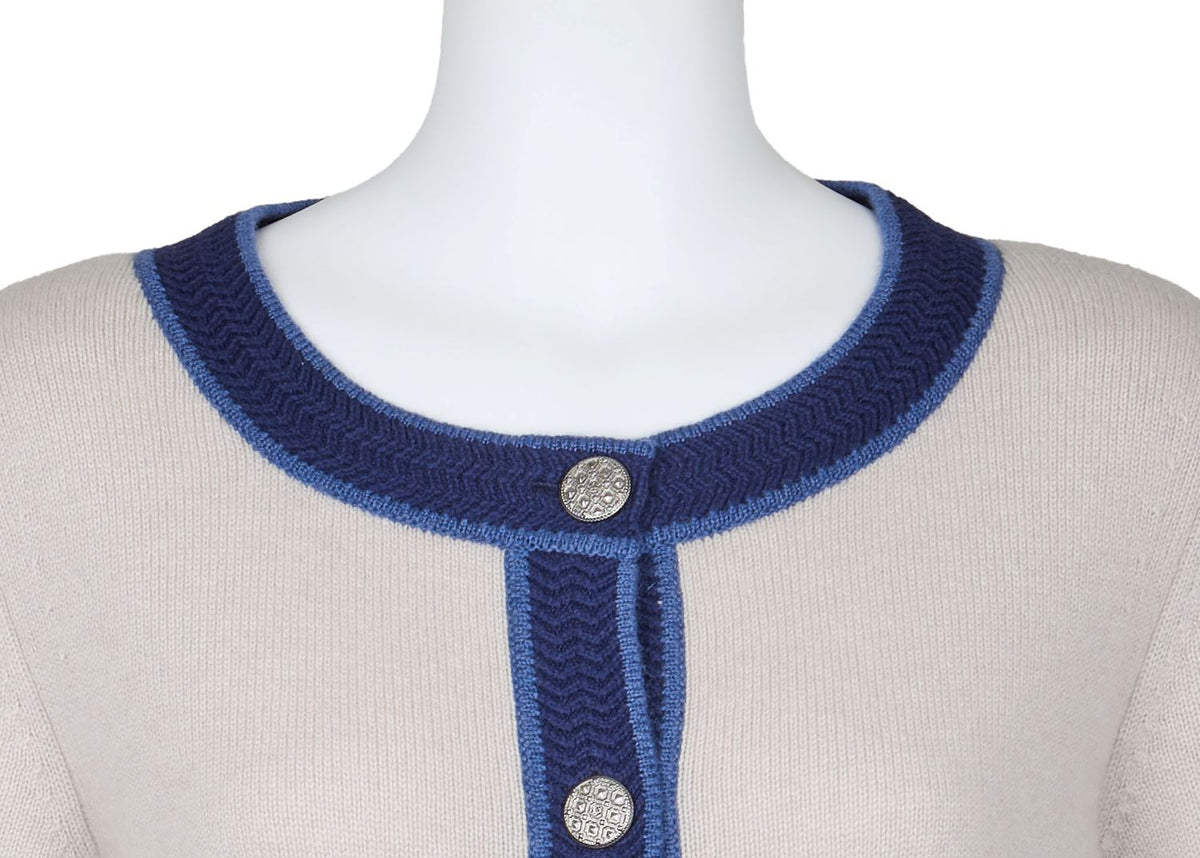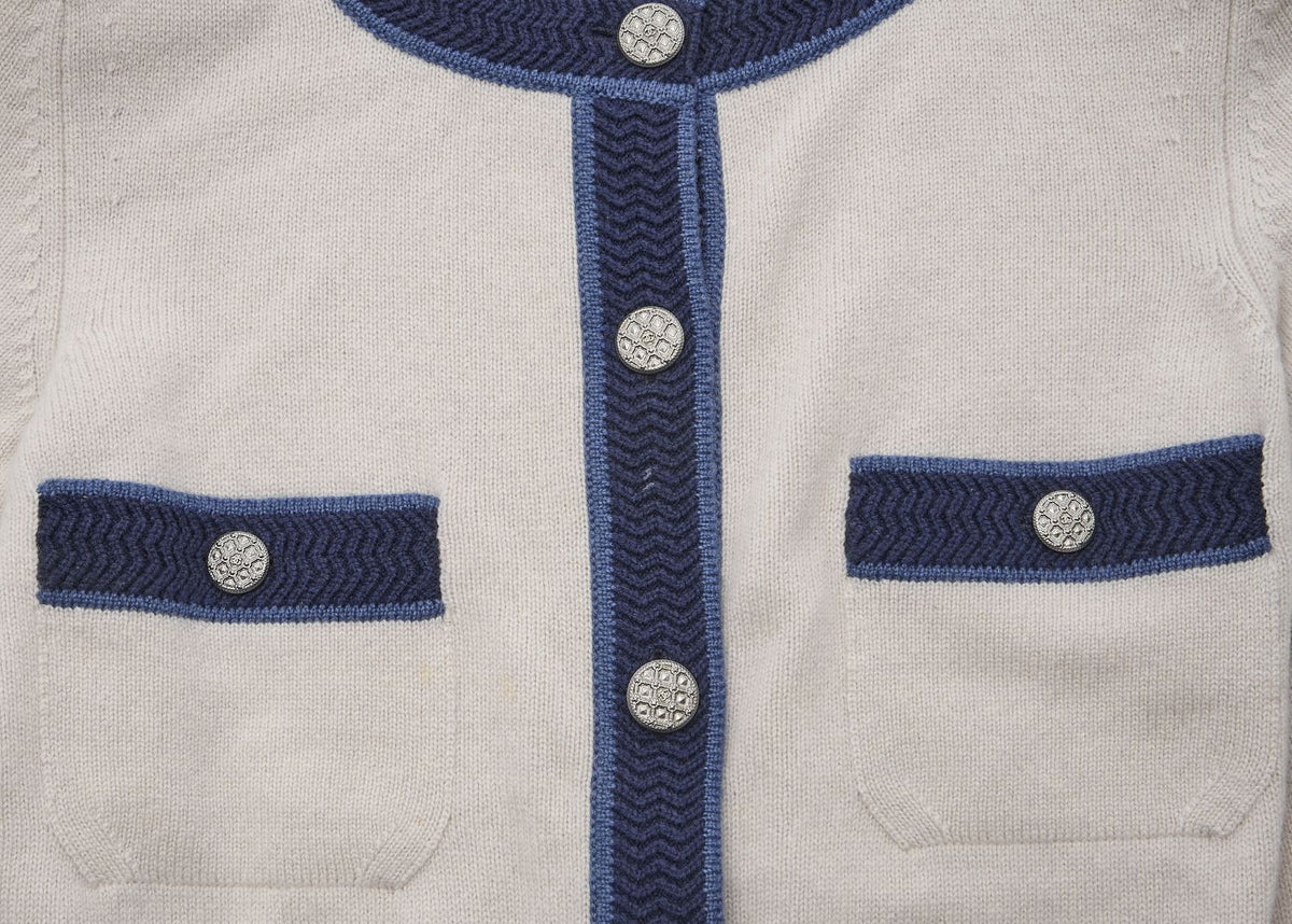 Elevate your wardrobe with the CHANEL Coco Button Cashmere Cardigan, an exquisite blend of elegance and comfort. Crafted from 100% premium cashmere, this cardigan in a stunning Grey and Blue hue is designed to keep you warm while exuding sophistication.