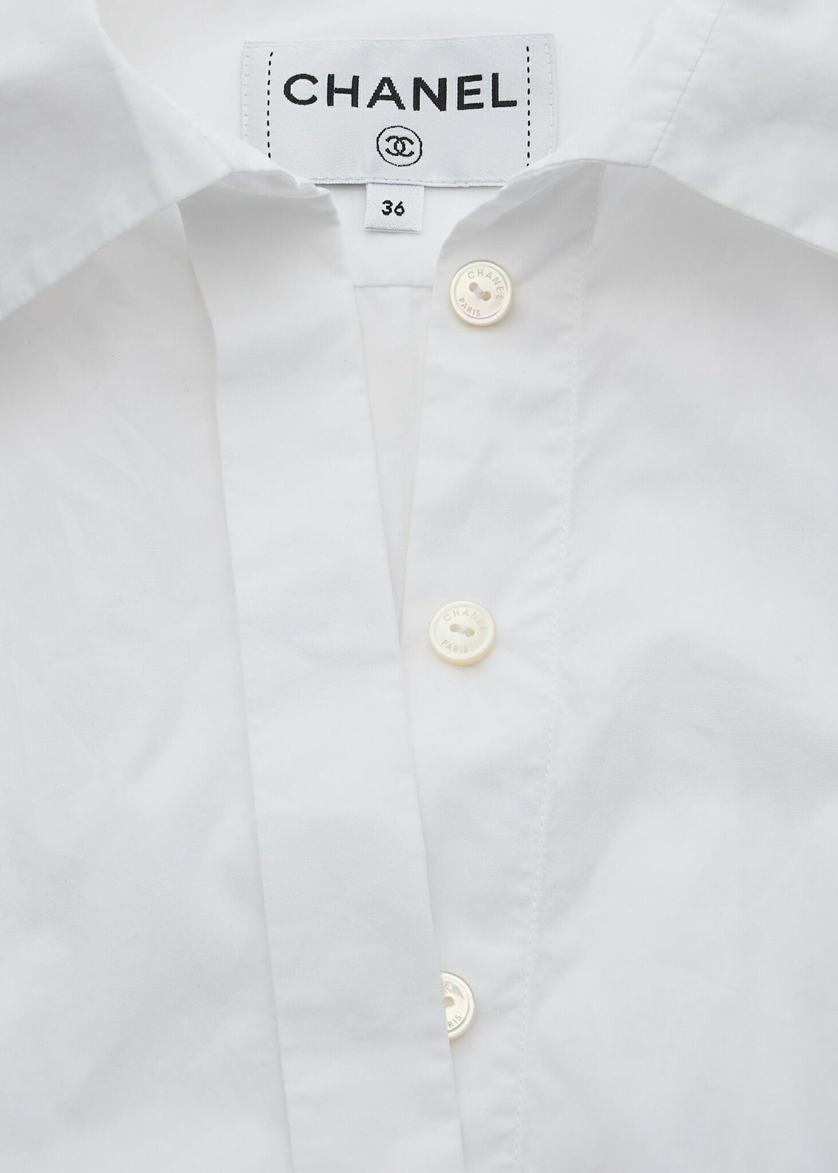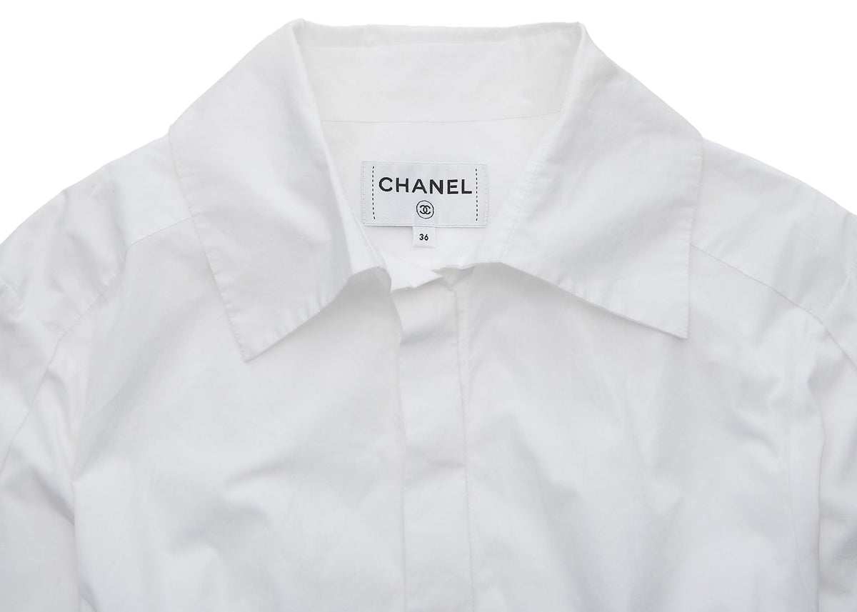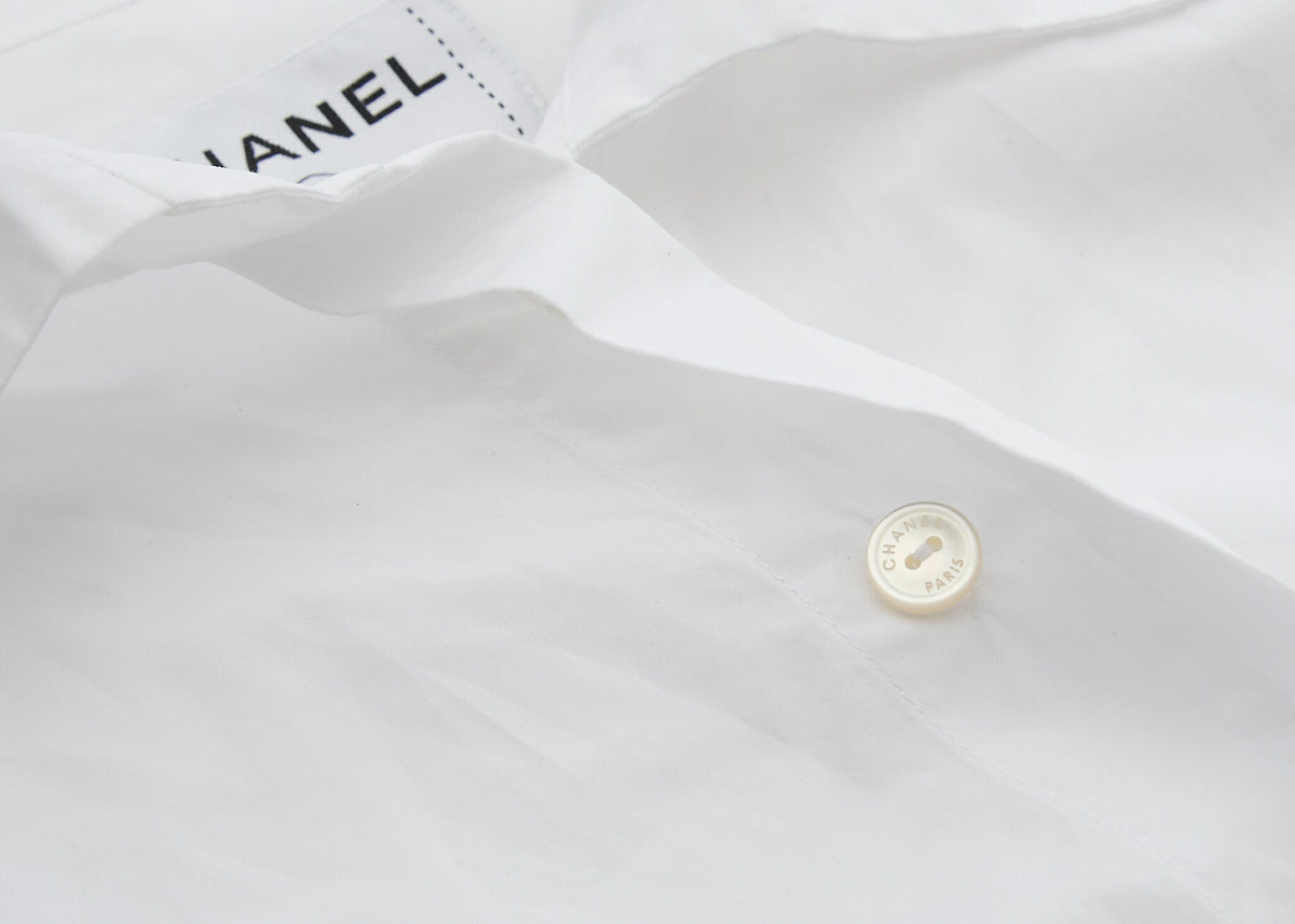 Elevate your wardrobe with the exquisite CHANEL Coco Button Shirt. This beautifully crafted cropped-length blouse is a timeless addition to any fashion-forward closet. Made from 100% premium cotton, this shirt offers a soft and breathable feel, ensuring comfort throughout the day.