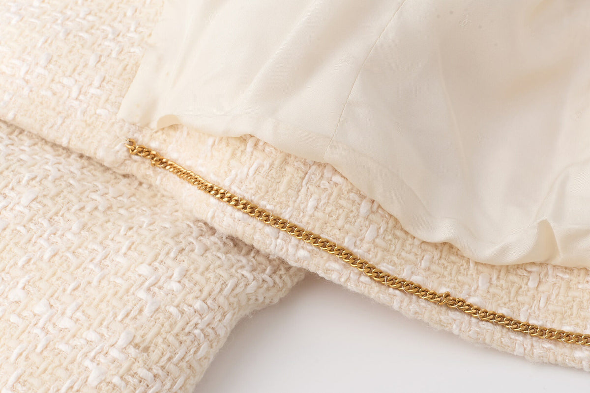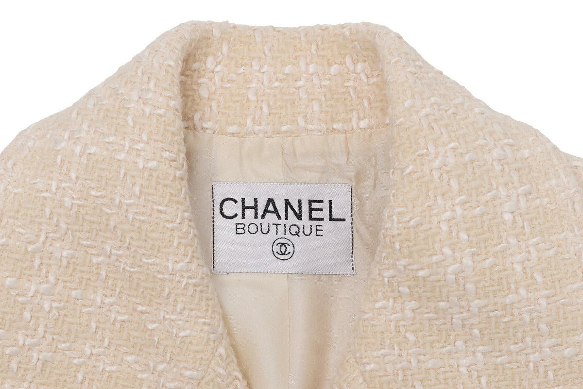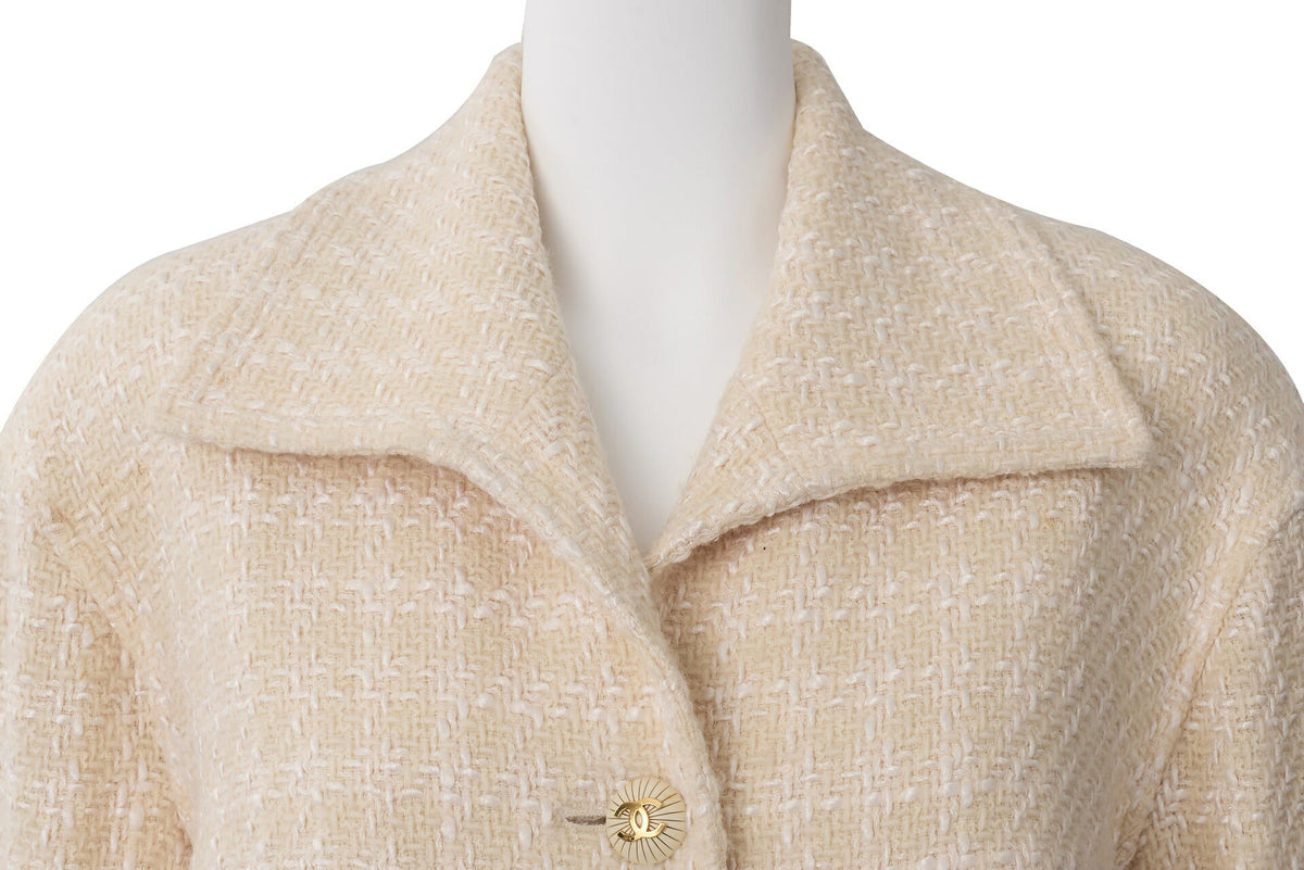 Elevate your outerwear collection with the exquisite CHANEL Coco Button Tweed Jacket. This stunning coat, elegantly designed in a refined beige and white color palette, embodies the timeless sophistication synonymous with the CHANEL brand.