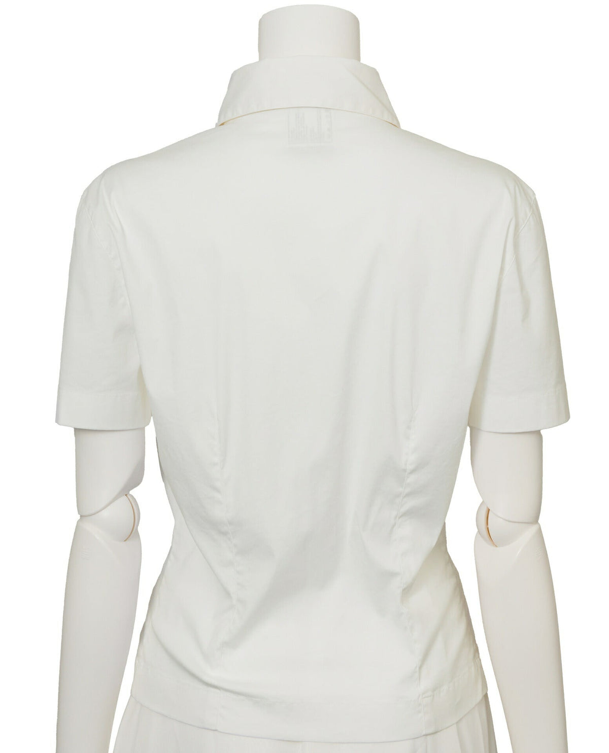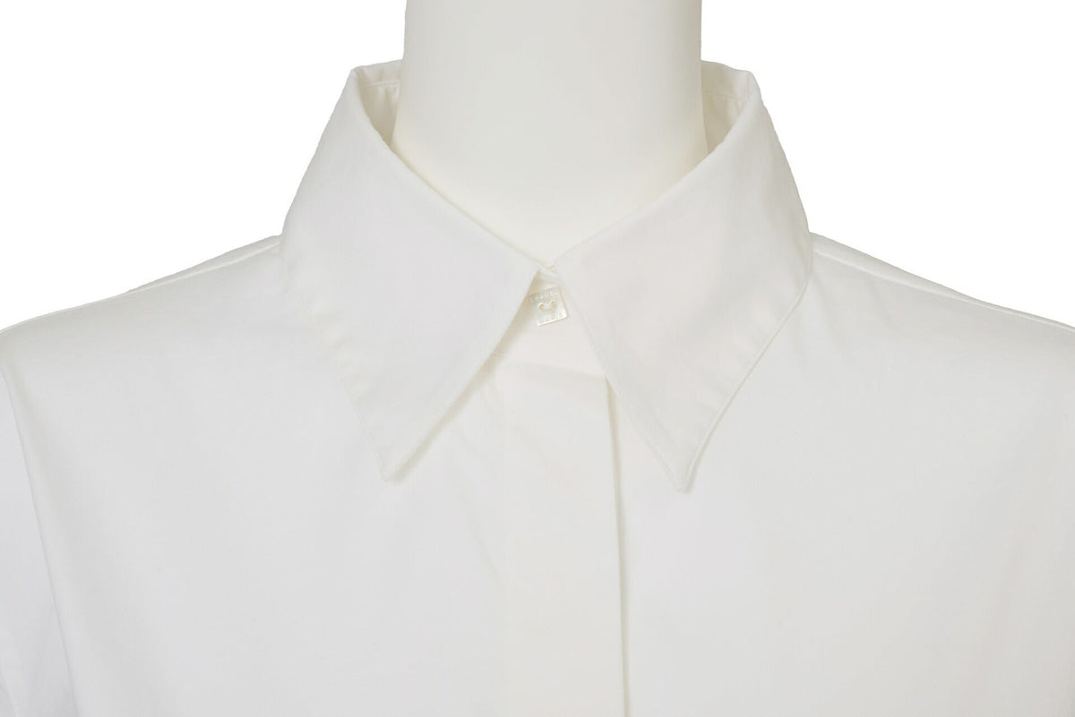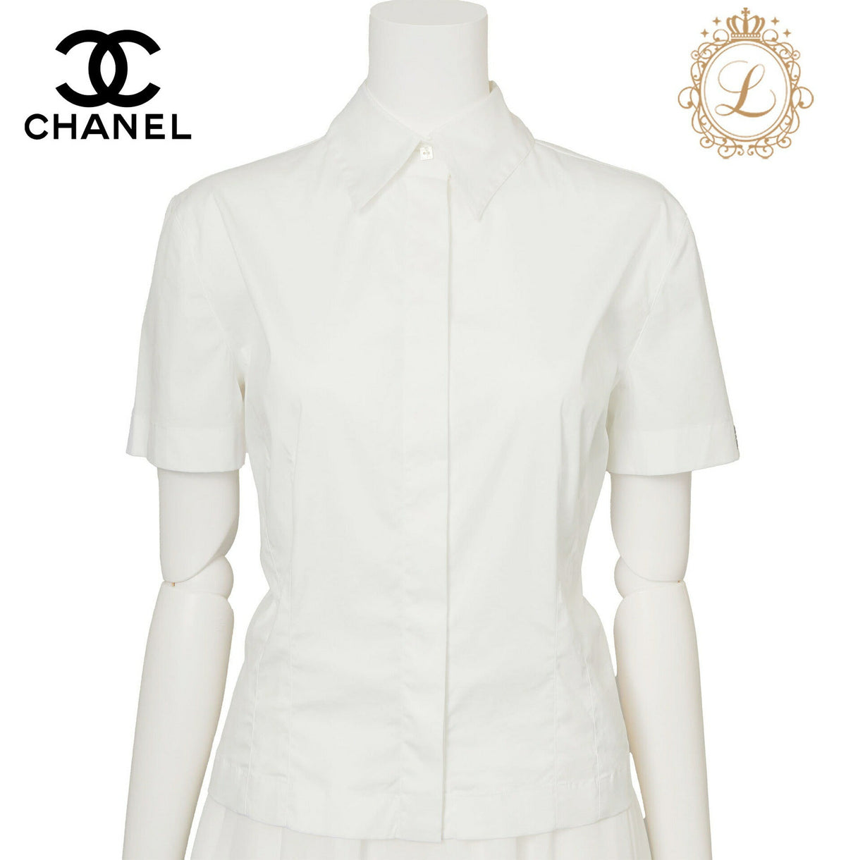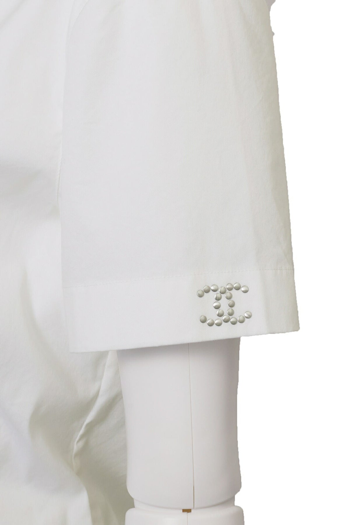Elevate your wardrobe with the CHANEL Coco Mark Metal Logo Button Short Sleeve Shirt Blouse T-shirt Size 38 White. This exquisite piece combines luxury and comfort, making it an essential addition to any fashion-forward collection. Crafted from a premium blend of 72% cotton, 23% nylon, and 5% spandex, it offers a soft, breathable fit that flatters your silhouette.