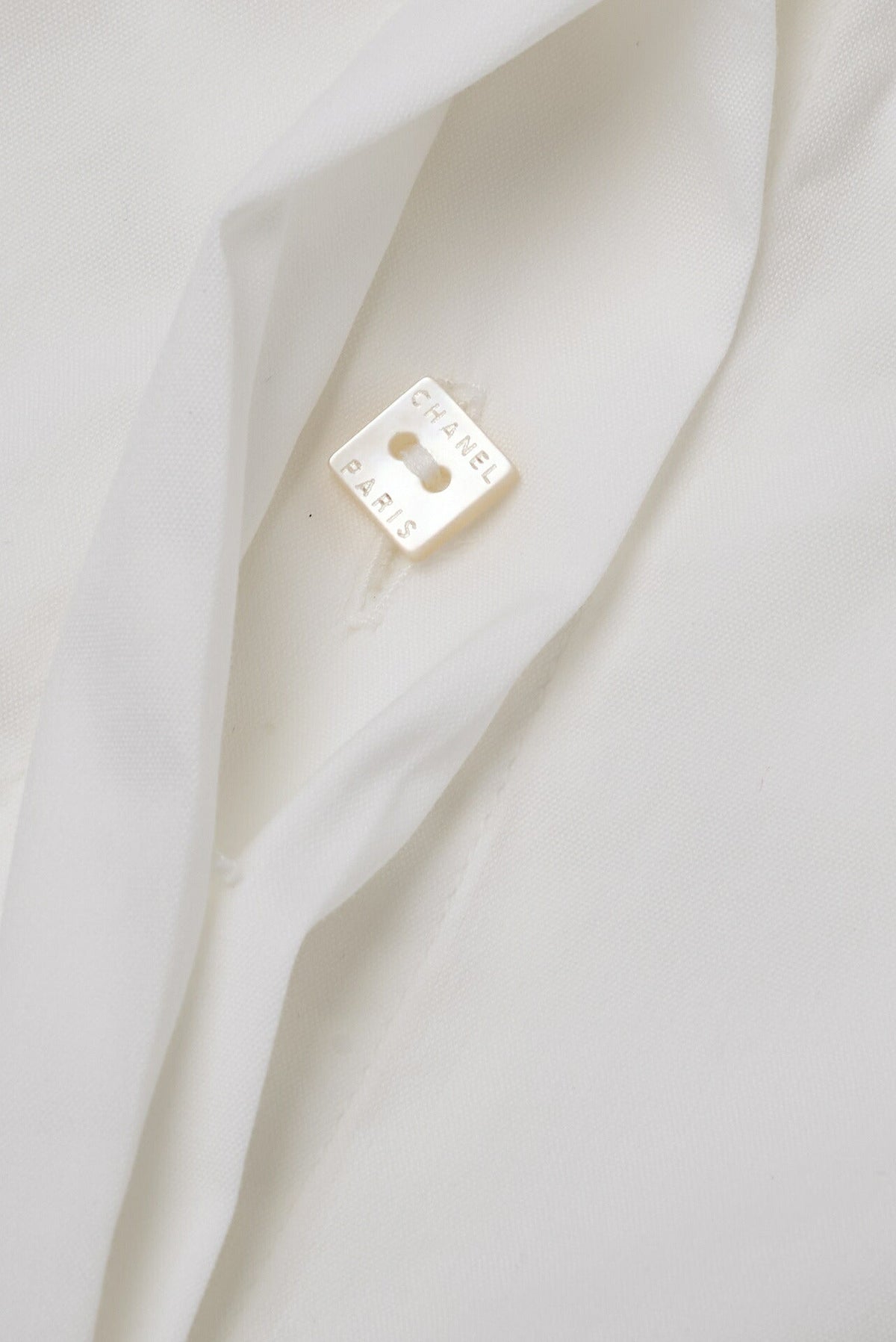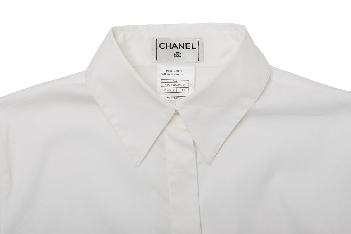 The Coco Mark Metal Logo Button detail adds a touch of elegance, showcasing the iconic CHANEL brand with sophistication. Perfect for casual outings or dressed-up occasions, this versatile blouse can seamlessly transition from day to night.