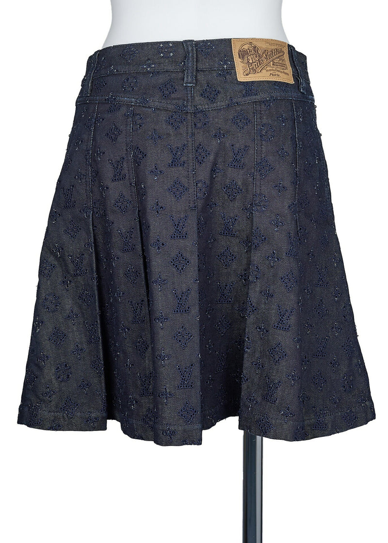 Pre-Owned Vuitton Pleated Skirt, Monogram Punching, Cotton, Blue, Silver-Tone Hardware, Pre-Owned