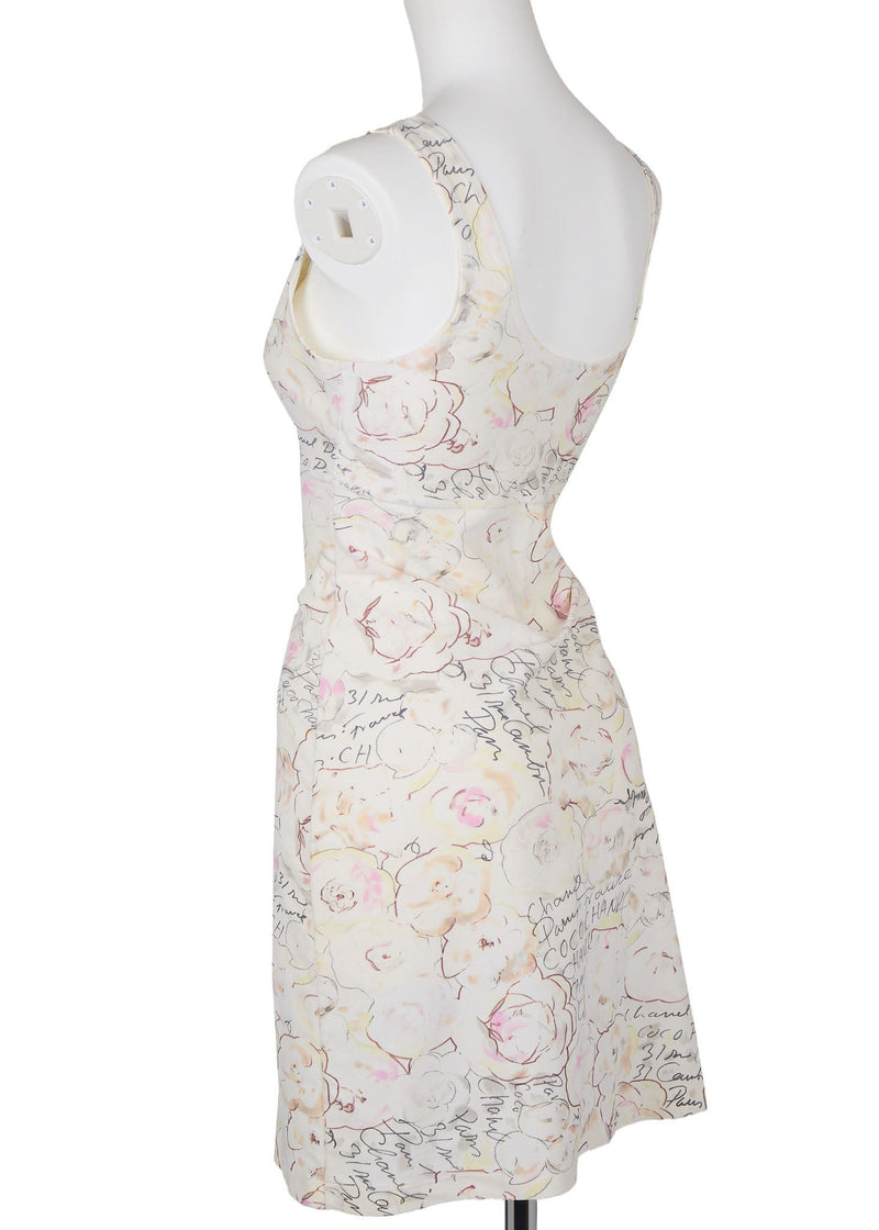 Pre-Owned Sleeveless Dress, Camellia Logo, Nylon Blend, Ivory, Silver-Tone Hardware, Pre-Owned